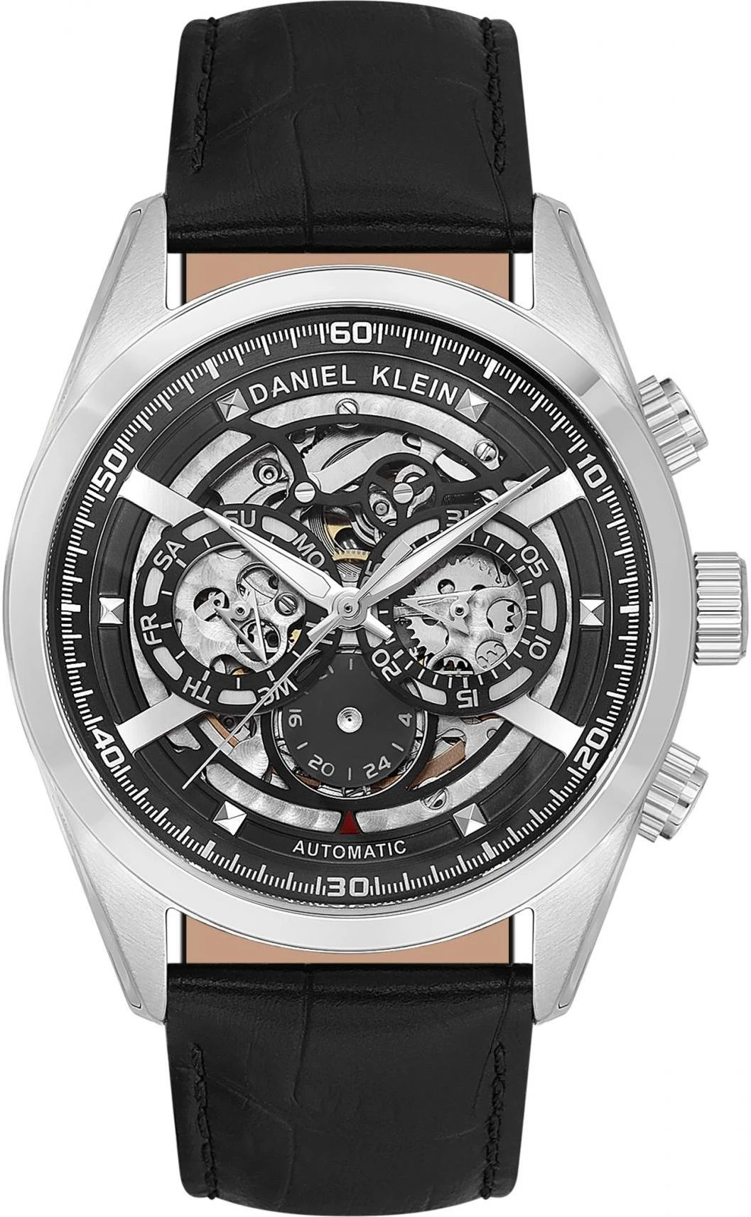 Мужские наручные часы Daniel Klein Skeleton 14016-2. Механические с автоподзаводом. Пружина механизма заводится автоматически благодаря естественным движениям владельца в процессе ежедневной носки часов. На стрелки и отметки нанесен светонакопительный состав, благодаря этому считывать информацию с циферблата возможно и в темноте. Ремешок изготовлен из кожи. Гибкость такого ремешка позволяет точно регулировать посадку часов на руке. Отображение времени возможно в 12-часовом или 24-часовом формате. Корпус изготовлен из высококачественной часовой латуни с высокими антикоррозийными свойствами. Прочное, устойчивое к царапинам минеральное стекло защищает часы от повреждений. Часы являются водонепроницаемыми до 5 Бар. Цвет корпуса: Серебристый. Цвет циферблата: Черный. Высота (с ушками): 42 мм. Толщина: 15 мм. Гарантия: 1 год.