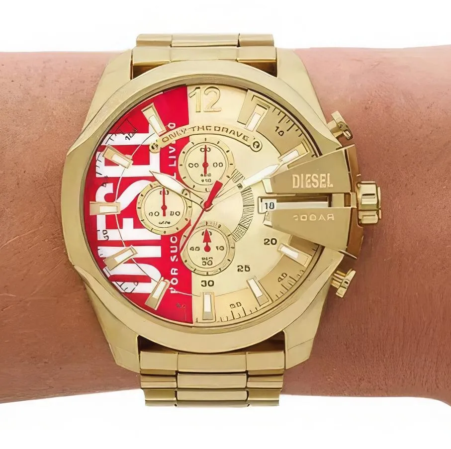Мужские наручные часы Diesel Mega Chief DZ4642. Точный кварцевый механизм с аналоговой индикацией. Браслет из нержавеющей стали. Функция хронографа. Браслет из нержавеющей стали. Прочное, устойчивое к царапинам минеральное стекло защищает часы от повреждений. На циферблате отображается текущее число месяца. Часы являются водонепроницаемыми до 10 Бар. Цвет циферблата: Желтое золото. Цвет корпуса: Золотистый. На стрелки и отметки нанесен светонакопительный состав, благодаря этому считывать информацию с циферблата возможно и в темноте. Толщина: 12 мм. Гарантия: 2 года.