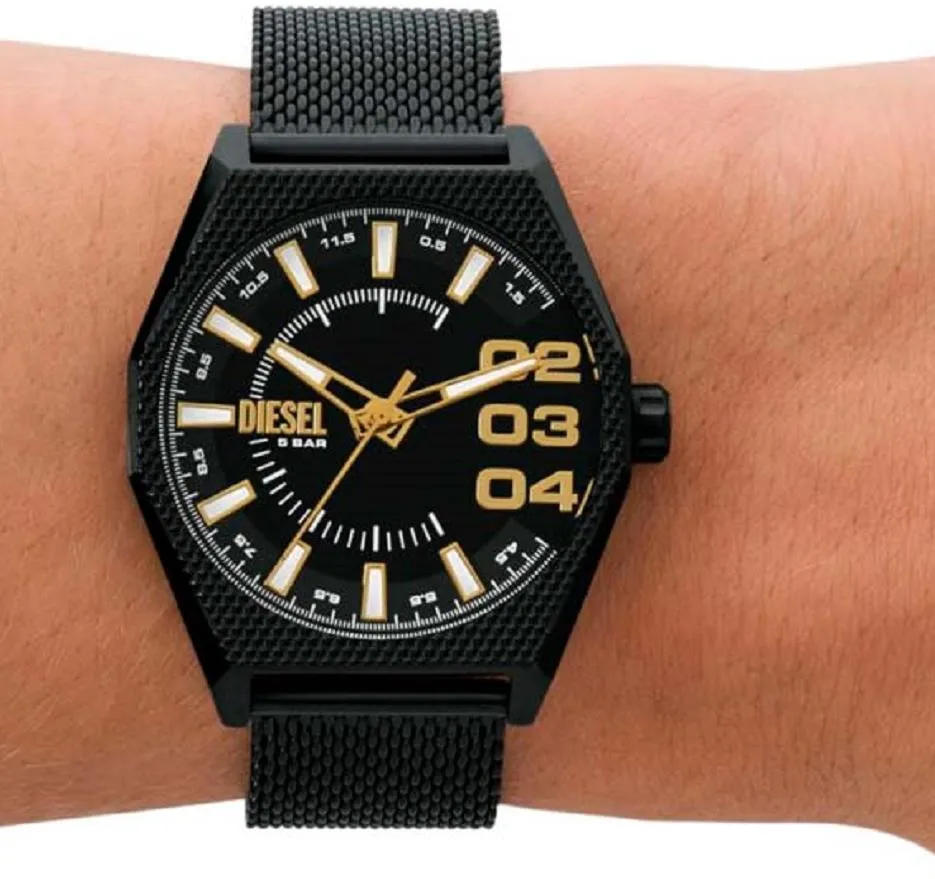 Мужские наручные часы Diesel Scraper DZ2194. Точный кварцевый механизм с аналоговой индикацией. Браслет из нержавеющей стали. Браслет из нержавеющей стали. Прочное, устойчивое к царапинам минеральное стекло защищает часы от повреждений. Часы являются водонепроницаемыми до 5 Бар. Цвет циферблата: Черный. Цвет корпуса: Черный. На стрелки и отметки нанесен светонакопительный состав, благодаря этому считывать информацию с циферблата возможно и в темноте. Толщина: 10 мм. Гарантия: 2 года.