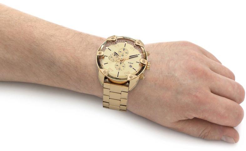Мужские наручные часы Diesel Spiked DZ4608. Точный кварцевый механизм с аналоговой индикацией. Корпус изготовлен из высококачественной нержавеющей стали 316L с высокими антикоррозийными свойствами. На циферблате отображается текущее число месяца. Функция хронографа. Браслет из нержавеющей стали. Прочное, устойчивое к царапинам минеральное стекло защищает часы от повреждений. Часы являются водонепроницаемыми до 5 Бар. Цвет корпуса: Желтое золото. Цвет циферблата: Золотистый. Ширина (с заводной головкой): 49мм. Толщина: 13мм. Гарантия: 2 года.
