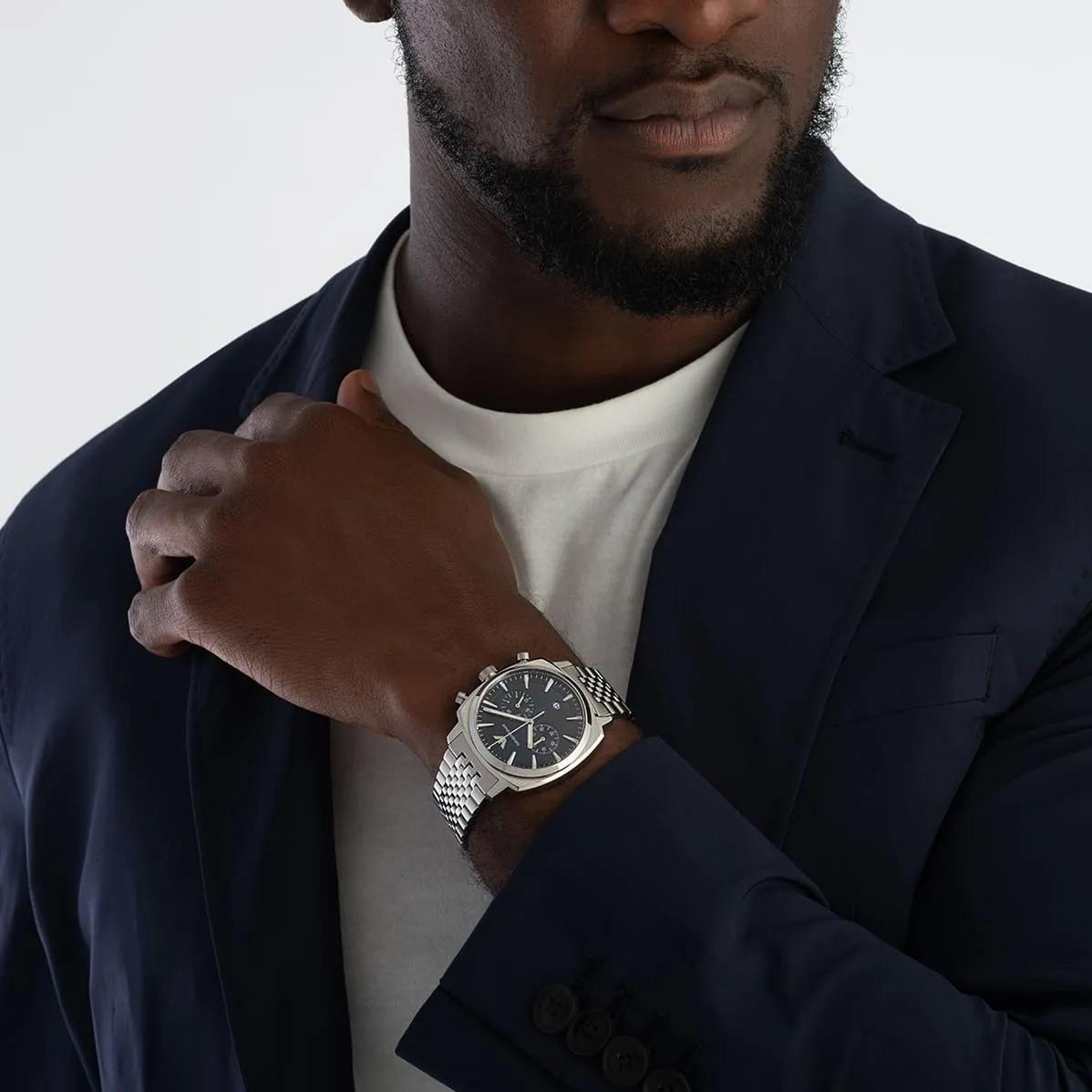 Мужские наручные часы Emporio Armani Carlo AR11688. Точный кварцевый механизм с аналоговой индикацией. В отличие от механических часов, не требуют завода и работают от батареи, показывая отклонение всего несколько секунд в месяц. Браслет из нержавеющей стали обладает высокой прочностью и износостойкостью, обеспечивая долговечность даже при активной эксплуатации. Материал устойчив к коррозии и сохраняет свой внешний вид надолго. Функция хронографа. Отображение времени возможно в 12-часовом или 24-часовом формате. Корпус изготовлен из высококачественной нержавеющей стали 316L с высокими антикоррозийными свойствами. Прочное, устойчивое к царапинам минеральное стекло защищает часы от повреждений. Часы являются водонепроницаемыми до 5 Бар. Цвет корпуса: Серебристый. Цвет циферблата: Синий. Толщина: 13 мм. Гарантия: 2 года.