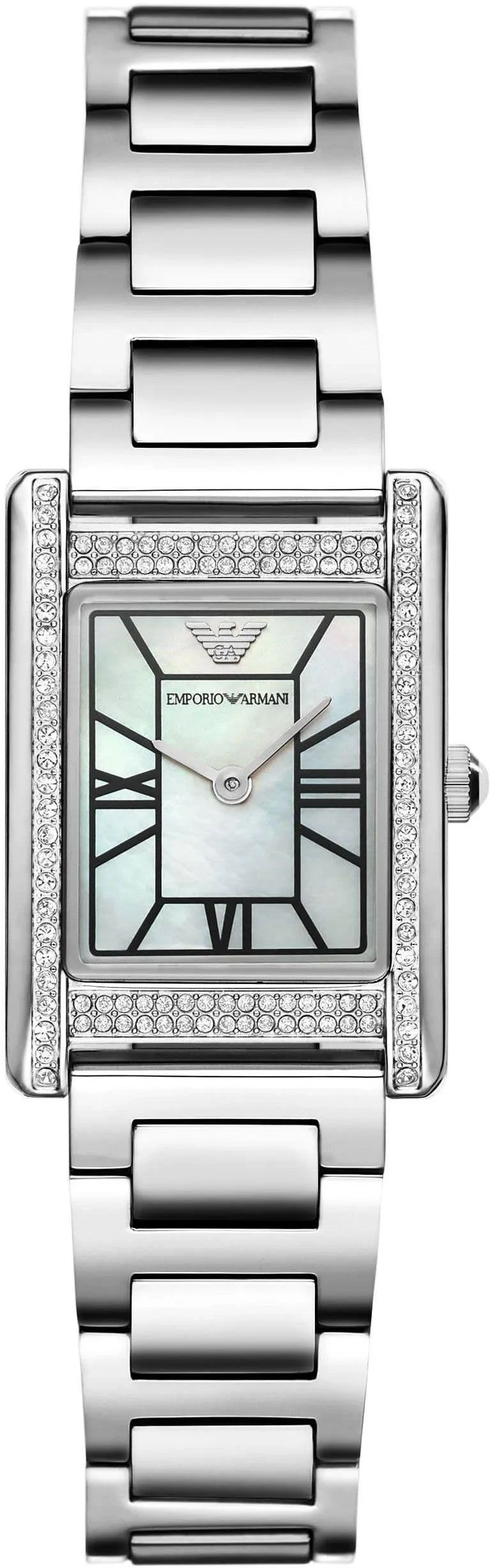 Эти женские наручные часы Emporio Armani Genni отличаются элегантным прямоугольным корпусом из стали. Циферблат выполнен из перламутра, где индексы представлены в виде римских цифр и штрихов. Особый шарм модели придают безель, инкрустированный кристаллами, и рифленая заводная головка, увенчанная кабошоном. Часы дополнены стальным браслетом с удобной раскладывающейся застежкой.