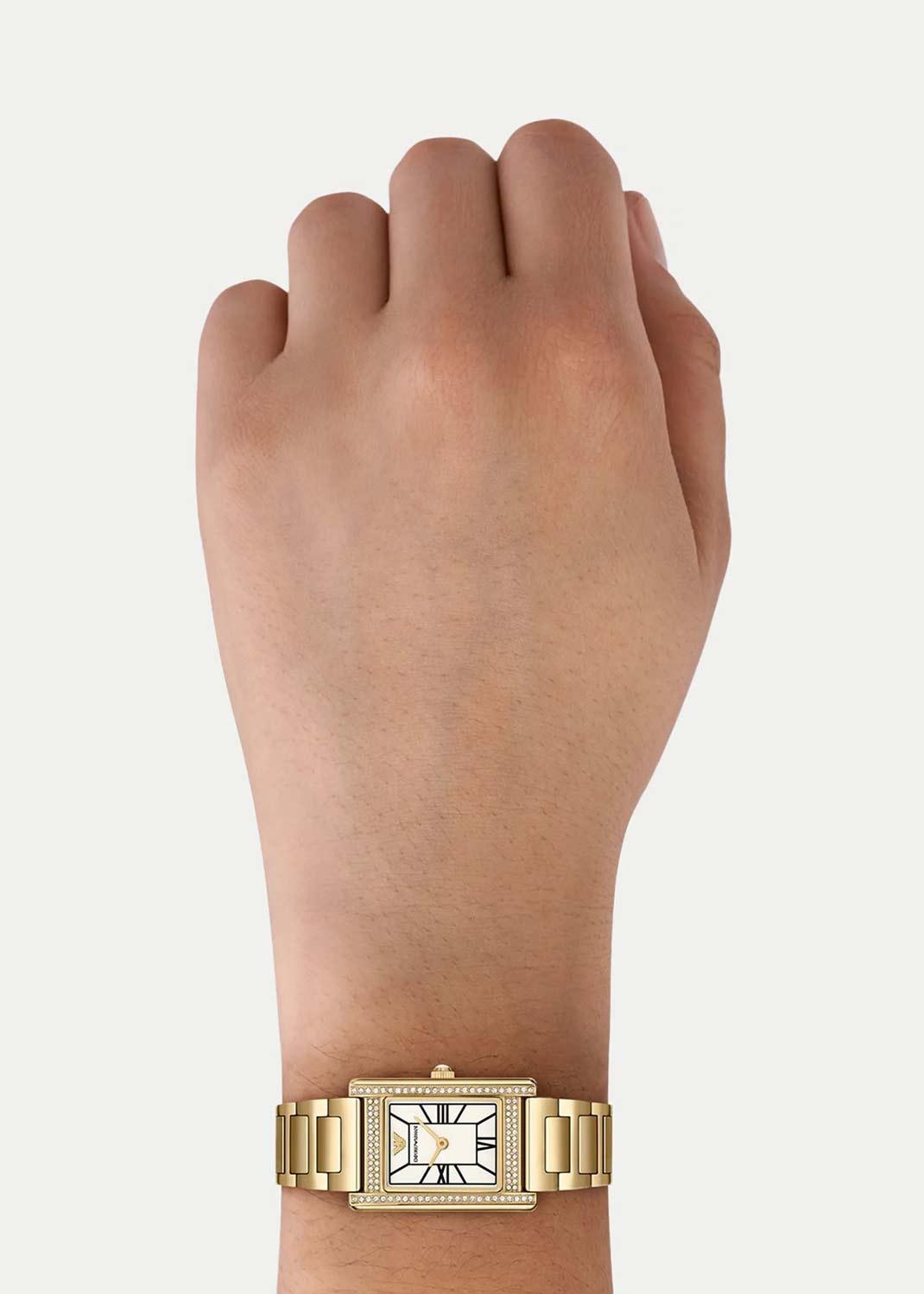 Эти женские наручные часы сочетают в себе геометричную строгость и изысканную роскошь. Прямоугольный стальной корпус обрамлен безелем, сверкающим кристальным паве. Лаконичный матовый циферблат с метками в виде римских цифр придает модели классическое звучание, а отсутствие секундной стрелки подчеркивает ее утонченную сдержанность. Особый шарм часам придает рифленая заводная головка, увенчанная изящным кабошоном. Модель завершается стальным браслетом с удобной раскладывающейся застежкой.