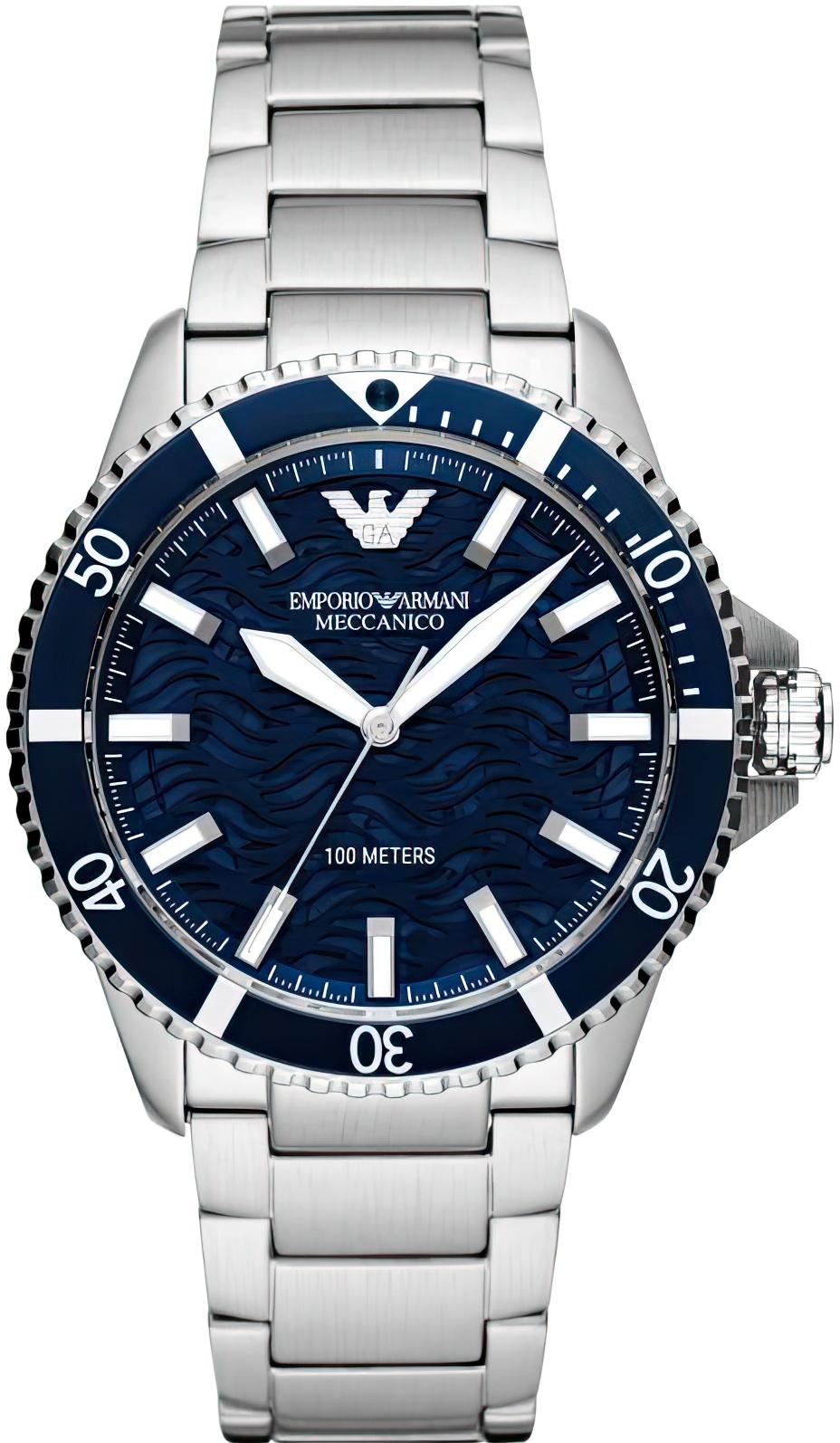 Мужские наручные часы Emporio Armani EA Diver AR60059. Механические с ручным подзаводом. Корпус изготовлен из высококачественной нержавеющей стали 316L с высокими антикоррозийными свойствами. На стрелки и отметки нанесен светонакопительный состав, благодаря этому считывать информацию с циферблата возможно и в темноте. Браслет из нержавеющей стали. Прочное, устойчивое к царапинам минеральное стекло защищает часы от повреждений. Часы являются водонепроницаемыми до 10 Бар. Цвет корпуса: Серебристый. Цвет циферблата: Синий. Ширина (с заводной головкой): 42мм. Толщина: 11мм. Гарантия: 2 года.