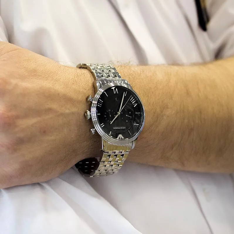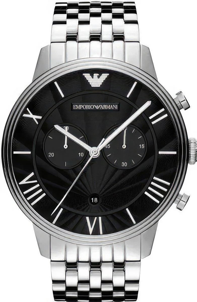 Мужские наручные часы Emporio Armani Sports AR1617. Точный кварцевый механизм с аналоговой индикацией. Корпус изготовлен из высококачественной нержавеющей стали 316L с высокими антикоррозийными свойствами. На стрелки и отметки нанесен светонакопительный состав, благодаря этому считывать информацию с циферблата возможно и в темноте. На циферблате отображается текущее число месяца. Функция хронографа. Браслет из нержавеющей стали. Прочное, устойчивое к царапинам минеральное стекло защищает часы от повреждений. Часы являются водонепроницаемыми до 5 Бар. Цвет корпуса: Серебристый. Цвет циферблата: Черный. Ширина (с заводной головкой): 45мм. Толщина: 12мм. Гарантия: 2 года.
