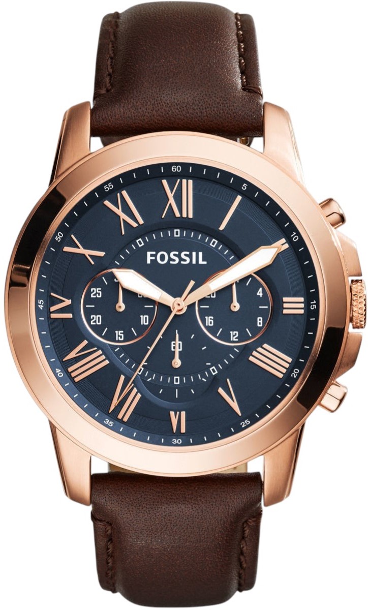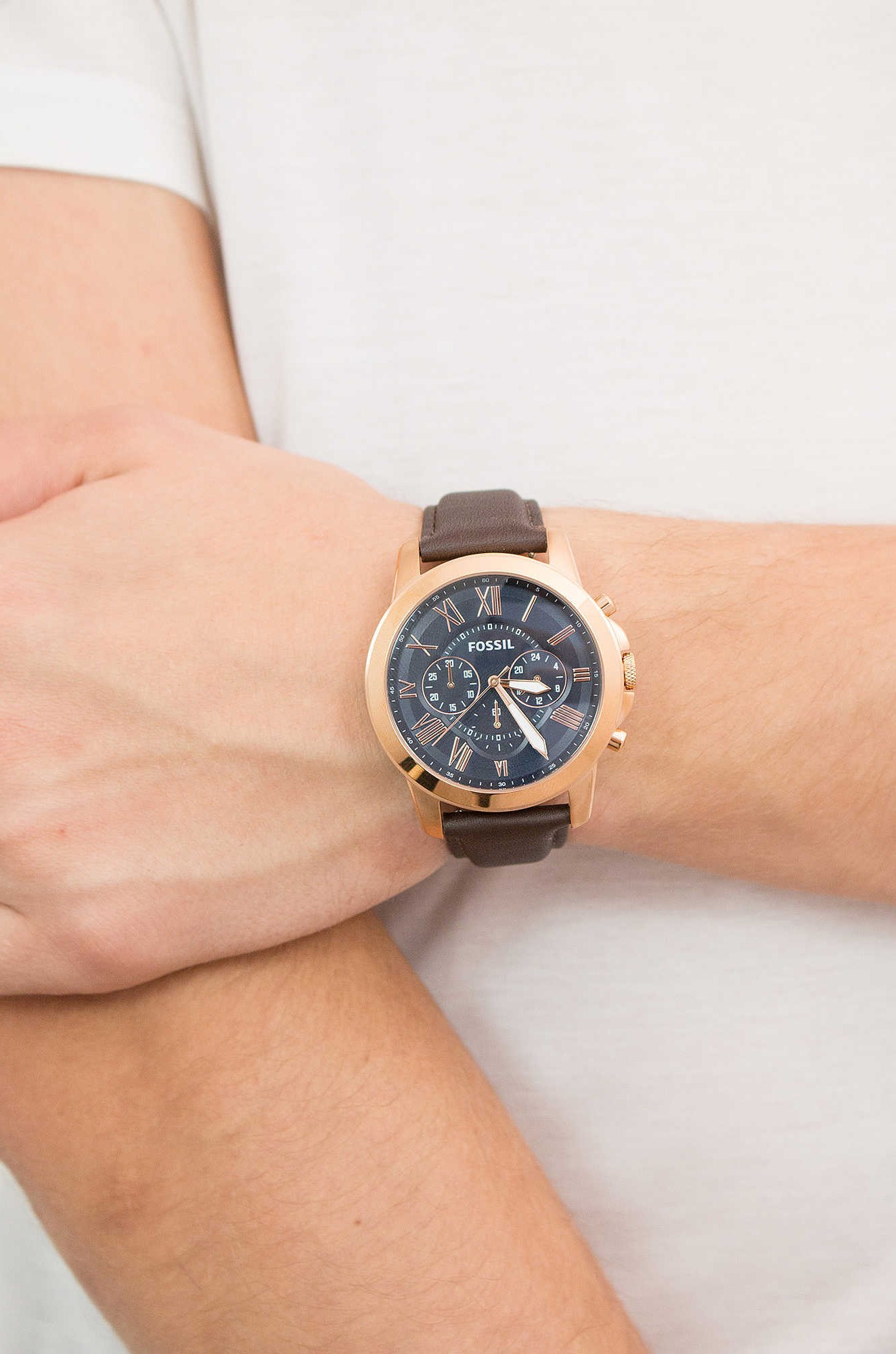 Мужские наручные часы, оснащённые хронографом с функцией секундомера и 24-х часовым форматом времени. Круглый корпус из нержавеющей стали со стойким покрытием цвета розового золота, на кожаном ремешке.