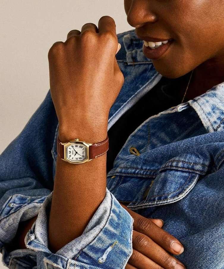 Женские часы Fossil ES5364 — это гармония классики и современного дизайна. Модель с 27-миллиметровым корпусом в золотистом IP-покрытии сочетает в себе элегантность и функциональность. Нежный бежевый циферблат с узором «елочка» и римскими цифрами дополнен рифленой заводной головкой для легкой настройки. Коричневый кожаный ремешок шириной 16 мм с контрастной строчкой и классической застежкой обеспечивает комфорт и универсальность. Благодаря минеральному стеклу и водонепроницаемости 3 ATM (30 метров) часы защищены от царапин и брызг. Изысканный дизайн и компактные размеры (длина ремешка 185 мм) делают эту модель идеальным аксессуаром для повседневного образа и особых случаев.