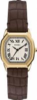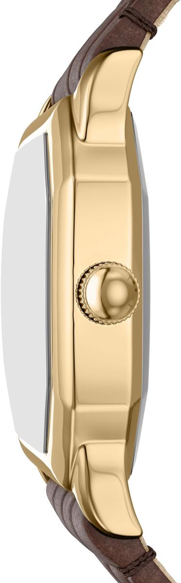 Модель имеет текстурированный кремовый циферблат с черными римскими цифрами и черными часовой, минутной и секундной стрелками. Циферблат обрамлен восьмиугольным корпусом из нержавеющей стали золотистого оттенка. Диаметр корпуса составляет 27 мм. Часы дополнены коричневым кожаным ремешком с тиснением под крокодила, застегивающимся на однозубчатую пряжку. Тип механизма - кварцевый. Водозащита 30 метров (3 АТМ/bar): минимальная защита от мелких брызг. Часы не предназначены для погружения в воду.