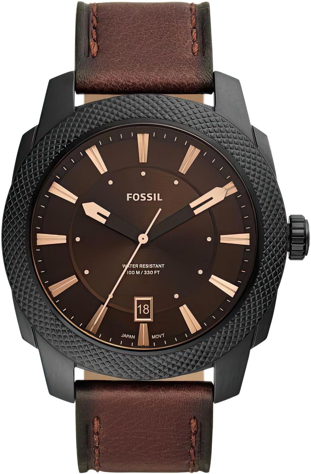 Мужские наручные часы Fossil Machine FS5972. Точный кварцевый механизм с аналоговой индикацией. Ремешок изготовлен из кожи. Браслет из нержавеющей стали. Прочное, устойчивое к царапинам минеральное стекло защищает часы от повреждений. На циферблате отображается текущее число месяца. Часы являются водонепроницаемыми до 10 Бар. Цвет циферблата: Черный. Цвет корпуса: Коричневый. Толщина: 13 мм. Гарантия: 2 года.