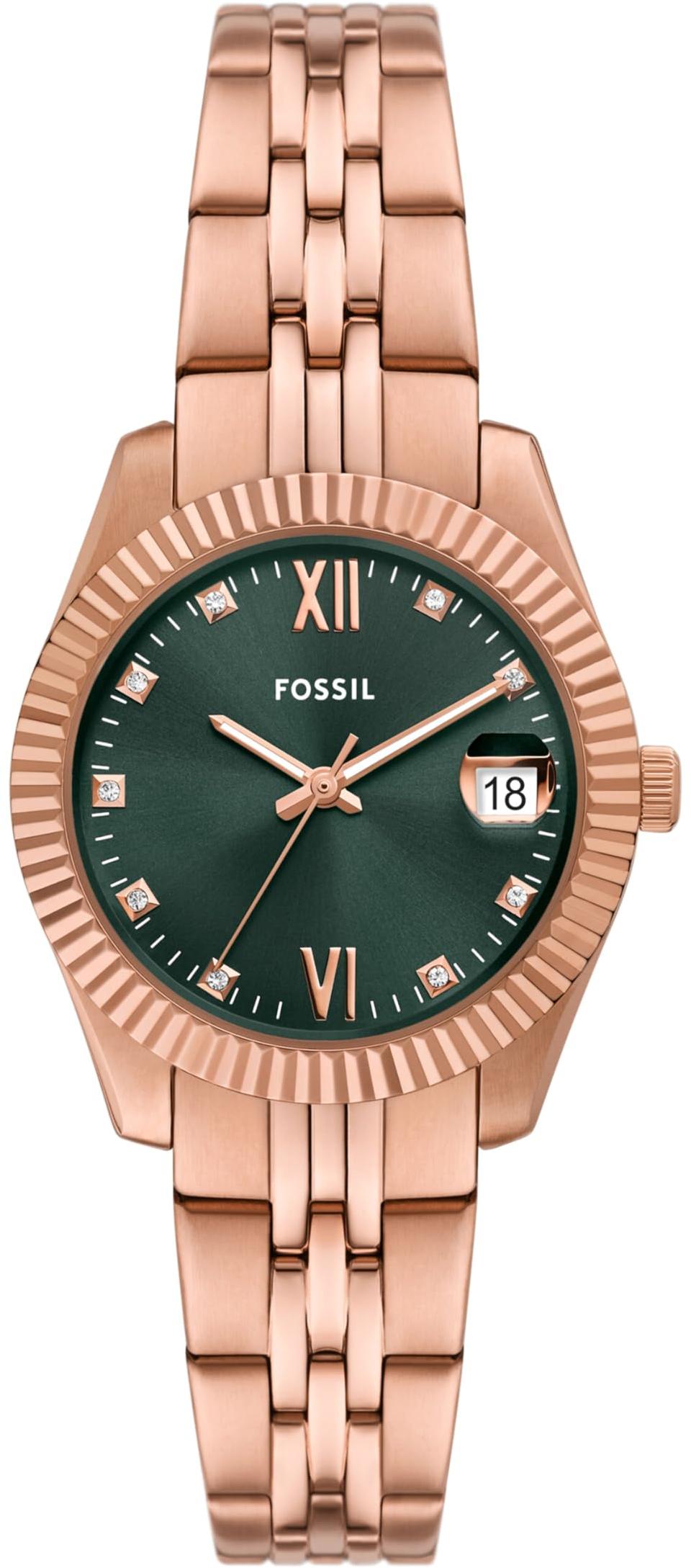 Женские наручные часы Fossil Scarlette ES5369. Точный кварцевый механизм с аналоговой индикацией. Браслет из нержавеющей стали. Браслет из нержавеющей стали. Прочное, устойчивое к царапинам минеральное стекло защищает часы от повреждений. На циферблате отображается текущее число месяца. Часы являются водонепроницаемыми до 5 Бар. Цвет циферблата: Розовое золото. Цвет корпуса: Зеленый. Светодиодная подсветка. Толщина: 11 мм. Гарантия: 2 года.