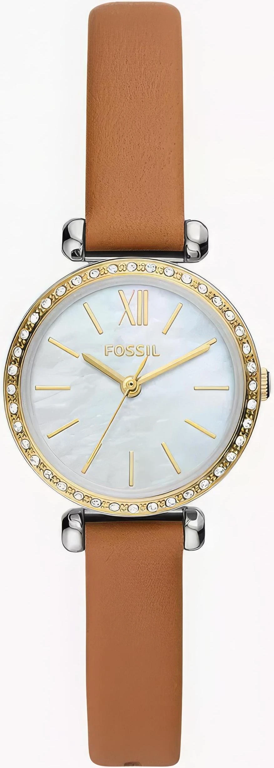 Женские наручные часы Fossil Tillie BQ3900. Точный кварцевый механизм с аналоговой индикацией. Ремешок изготовлен из кожи. Браслет из нержавеющей стали. Прочное, устойчивое к царапинам минеральное стекло защищает часы от повреждений. Часы являются водонепроницаемыми до 5 Бар. Цвет циферблата: Желтое золото. Цвет корпуса: Перламутровый. Толщина: 10 мм. Гарантия: 2 года.