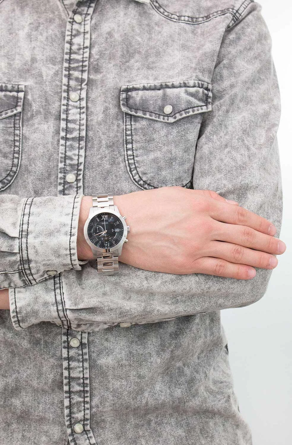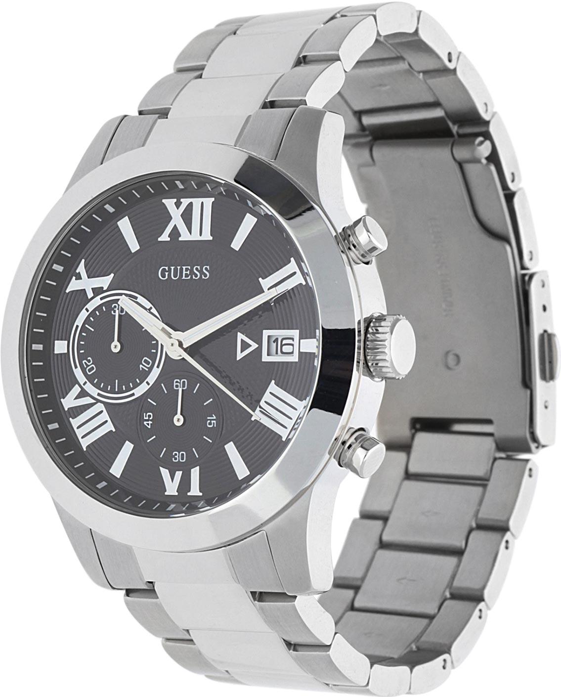 Мужские наручные часы Guess Atlas W0668G3. Точный кварцевый механизм с аналоговой индикацией. Корпус изготовлен из высококачественной нержавеющей стали 316L с высокими антикоррозийными свойствами. На стрелки и отметки нанесен светонакопительный состав, благодаря этому считывать информацию с циферблата возможно и в темноте. На циферблате отображается текущее число месяца. Функция хронографа. Браслет из нержавеющей стали. Прочное, устойчивое к царапинам минеральное стекло защищает часы от повреждений. Часы являются водонепроницаемыми до 5 Бар. Цвет корпуса: Серебристый. Цвет циферблата: Черный. Ширина (с заводной головкой): 45мм. Толщина: 12мм. Гарантия: 2 года.