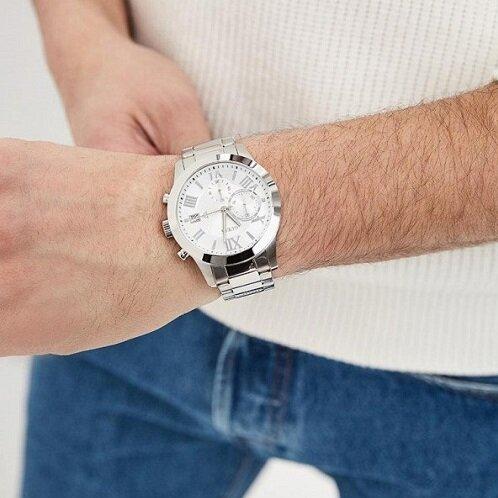 Мужские наручные часы Guess Atlas W0668G7. Точный кварцевый механизм с аналоговой индикацией. Корпус изготовлен из высококачественной нержавеющей стали 316L с высокими антикоррозийными свойствами. На стрелки и отметки нанесен светонакопительный состав, благодаря этому считывать информацию с циферблата возможно и в темноте. На циферблате отображается текущее число месяца. Функция хронографа. Браслет из нержавеющей стали. Прочное, устойчивое к царапинам минеральное стекло защищает часы от повреждений. Часы являются водонепроницаемыми до 5 Бар. Цвет корпуса: Серебристый. Цвет циферблата: Серебристый. Ширина (с заводной головкой): 45мм. Толщина: 12мм. Гарантия: 2 года.
