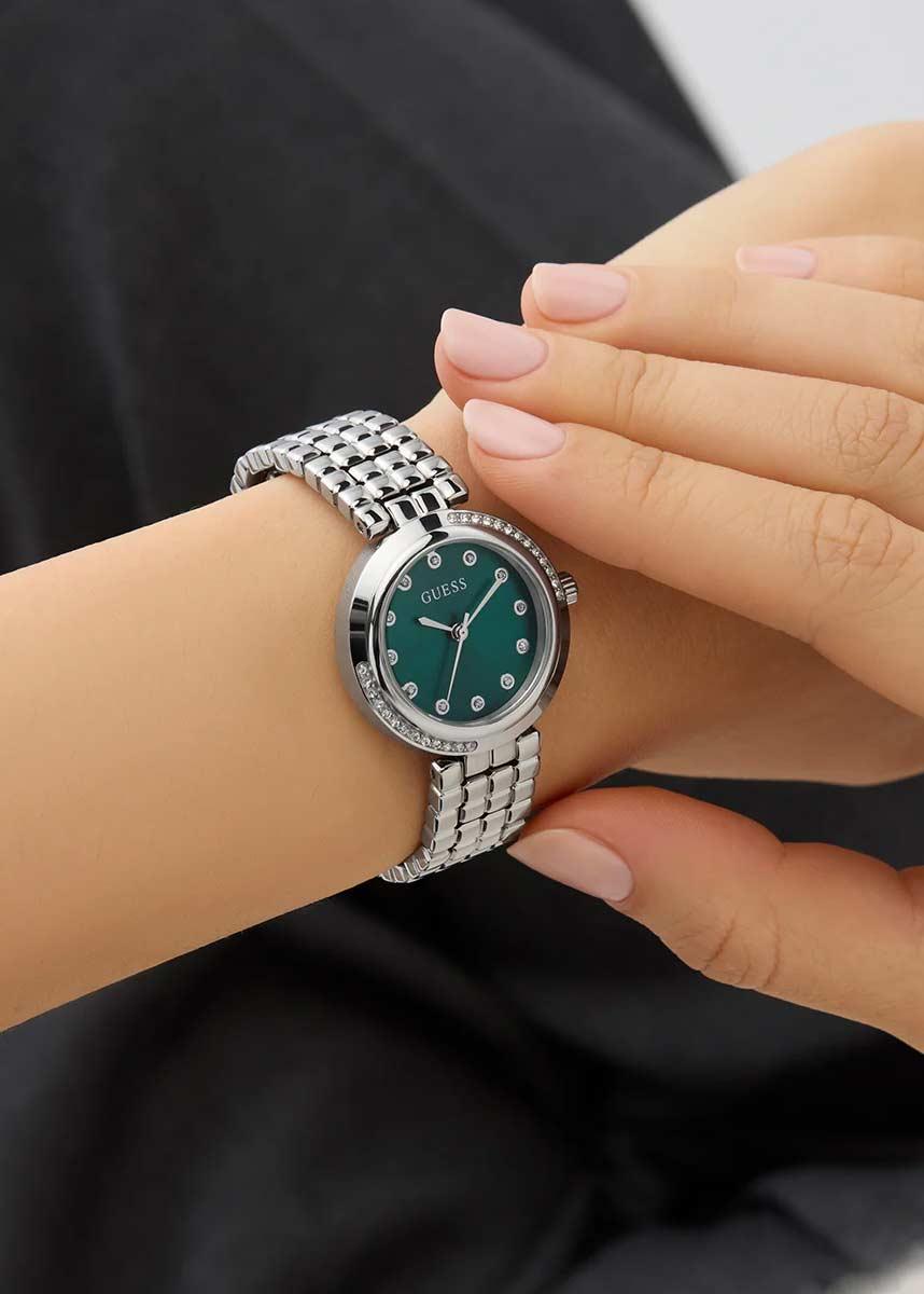 Женские наручные часы Guess Bejeweled GW0930L1. Точный кварцевый механизм с аналоговой индикацией. В отличие от механических часов, не требуют завода и работают от батареи, показывая отклонение всего несколько секунд в месяц. Браслет из нержавеющей стали обладает высокой прочностью и износостойкостью, обеспечивая долговечность даже при активной эксплуатации. Материал устойчив к коррозии и сохраняет свой внешний вид надолго. Корпус изготовлен из высококачественной нержавеющей стали 316L с высокими антикоррозийными свойствами. Прочное, устойчивое к царапинам минеральное стекло защищает часы от повреждений. Часы являются водонепроницаемыми до 3 Бар. Цвет корпуса: Серебристый. Цвет циферблата: Зеленый. Высота (с ушками): 28 мм. Толщина: 8 мм. Гарантия: 2 года.