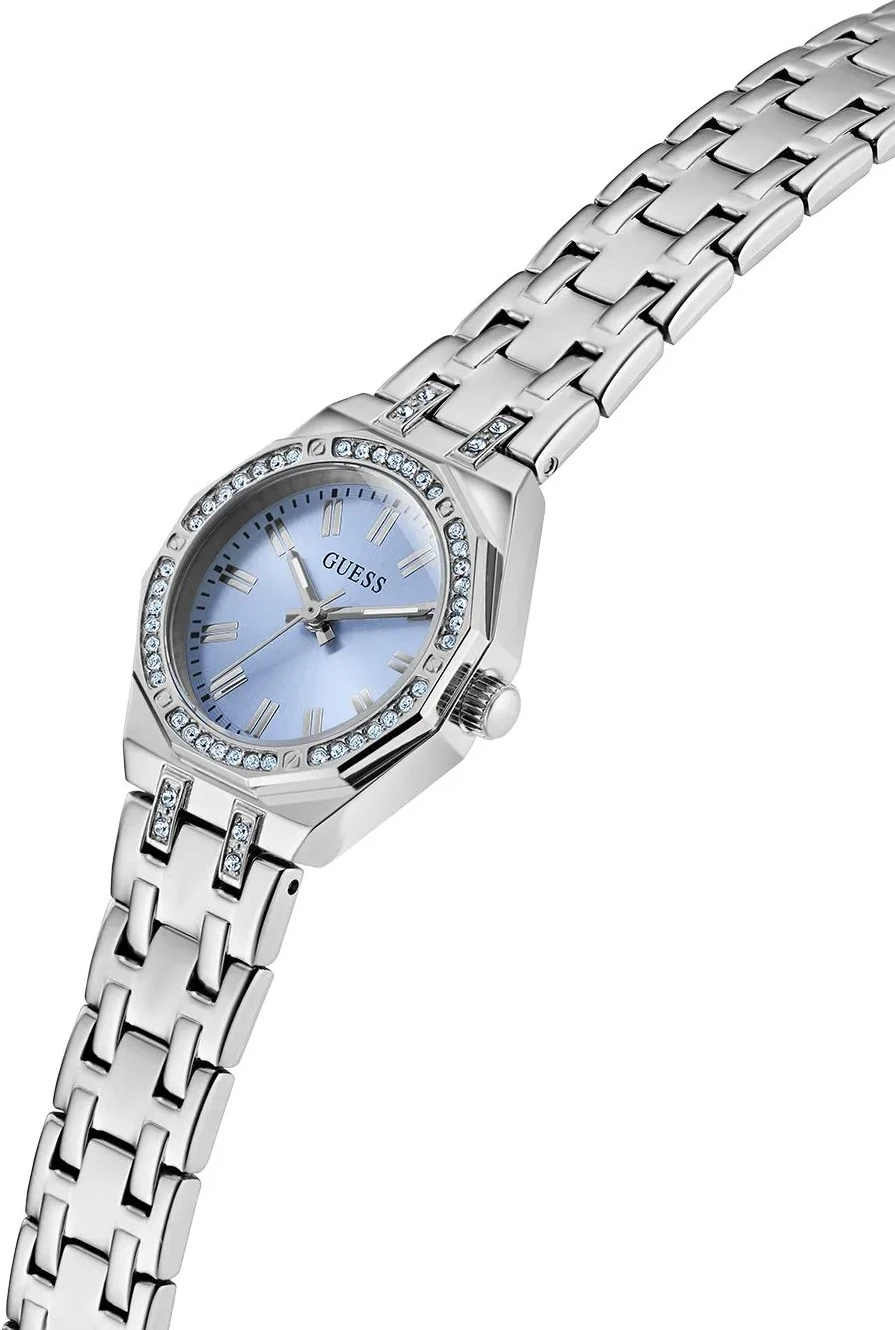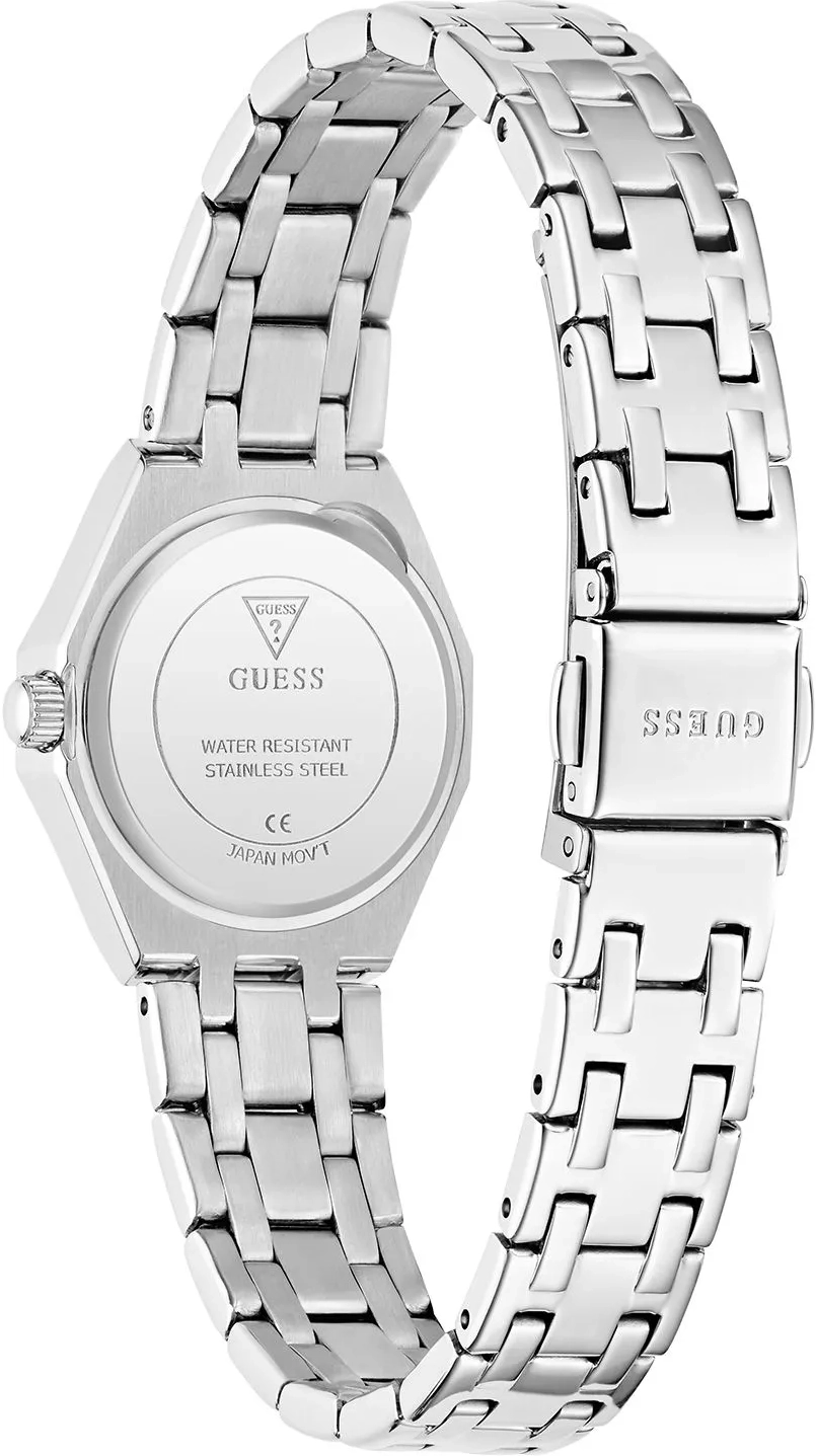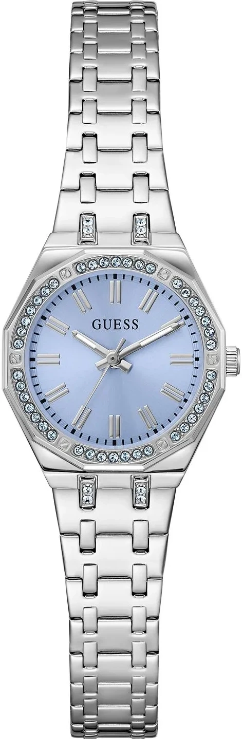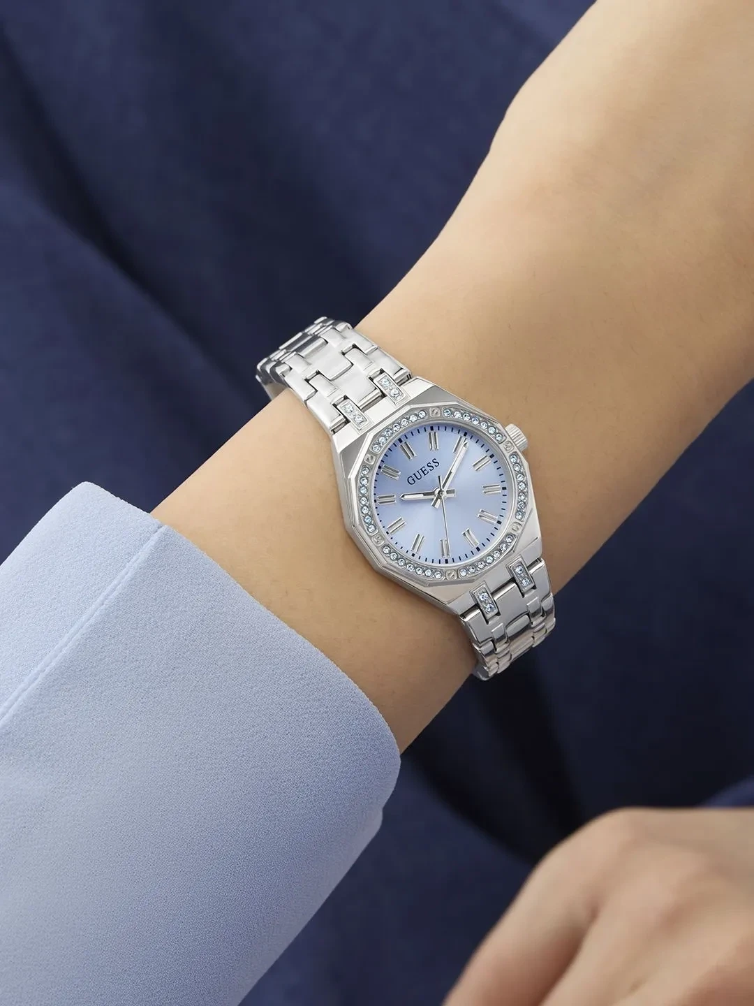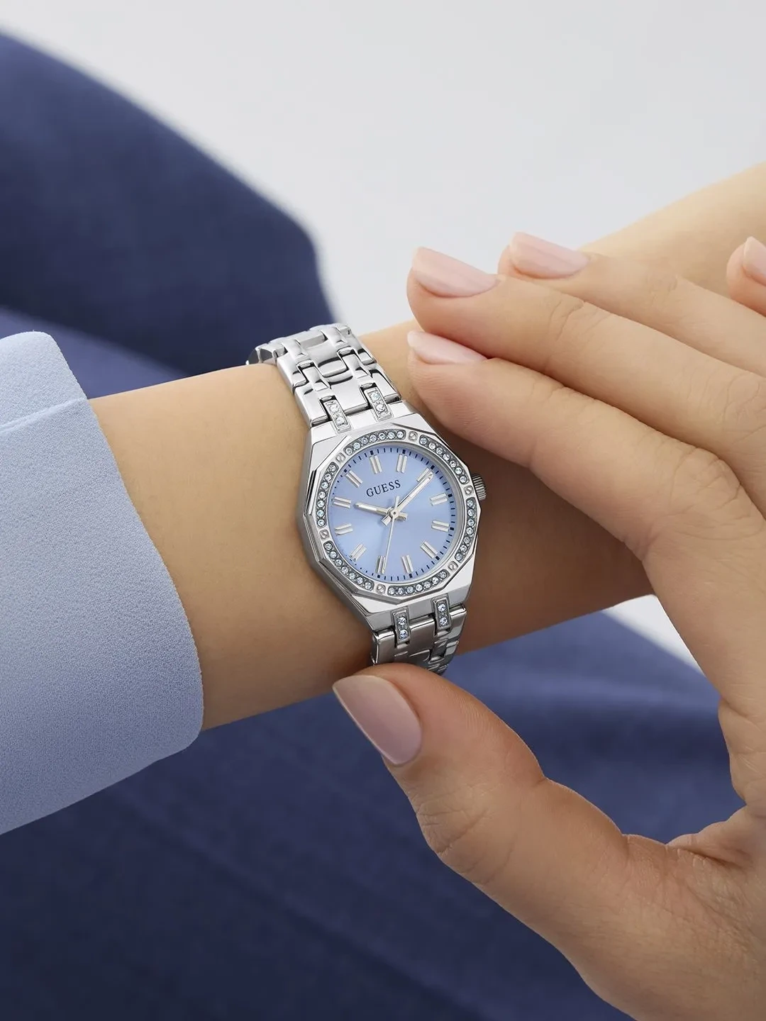 Женские наручные часы Guess Bejeweled GW1010L1. Точный кварцевый механизм с аналоговой индикацией. В отличие от механических часов, не требуют завода и работают от батареи, показывая отклонение всего несколько секунд в месяц. На стрелки и отметки нанесен светонакопительный состав, благодаря этому считывать информацию с циферблата возможно и в темноте. Браслет из нержавеющей стали обладает высокой прочностью и износостойкостью, обеспечивая долговечность даже при активной эксплуатации. Материал устойчив к коррозии и сохраняет свой внешний вид надолго. Корпус изготовлен из высококачественной нержавеющей стали 316L с высокими антикоррозийными свойствами. Прочное, устойчивое к царапинам минеральное стекло защищает часы от повреждений. Часы являются водонепроницаемыми до 3 Бар. Цвет корпуса: Серебристый. Цвет циферблата: Голубой. Высота (с ушками): 25 мм. Толщина: 8 мм. Гарантия: 2 года.