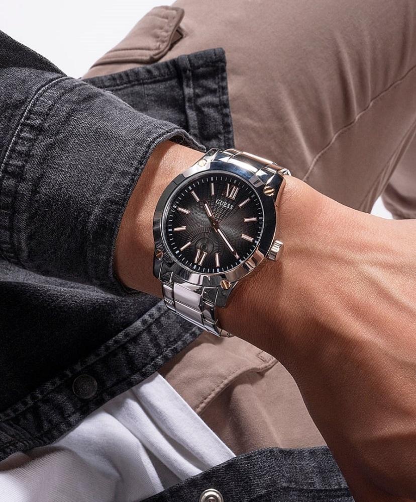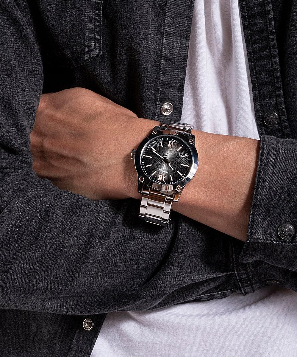 Мужские наручные часы Guess Steel GW0574G1. Точный кварцевый механизм с аналоговой индикацией. Корпус изготовлен из высококачественной нержавеющей стали 316L с высокими антикоррозийными свойствами. На стрелки и отметки нанесен светонакопительный состав, благодаря этому считывать информацию с циферблата возможно и в темноте. Браслет из нержавеющей стали. Прочное, устойчивое к царапинам минеральное стекло защищает часы от повреждений. Часы являются водонепроницаемыми до 5 Бар. Цвет корпуса: Серебристый. Цвет циферблата: Черный. Ширина (с заводной головкой): 44мм. Толщина: 11мм. Гарантия: 2 года.