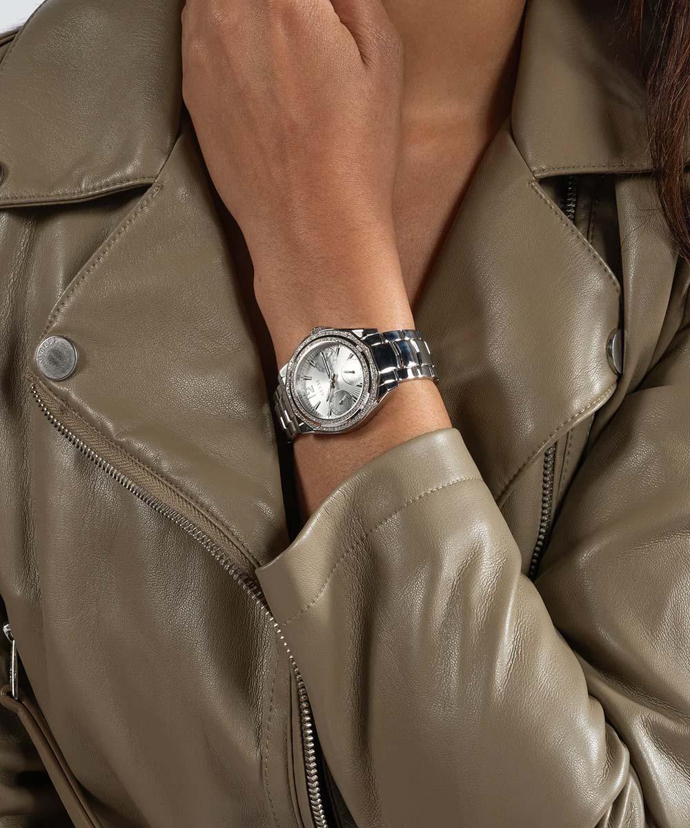 Женские наручные часы Guess Dress GW0685L1. Точный кварцевый механизм с аналоговой индикацией. В отличие от механических часов, не требуют завода и работают от батареи, показывая отклонение всего несколько секунд в месяц. Браслет из нержавеющей стали обладает высокой прочностью и износостойкостью, обеспечивая долговечность даже при активной эксплуатации. Материал устойчив к коррозии и сохраняет свой внешний вид надолго. Отображение времени возможно в 12-часовом или 24-часовом формате. Корпус изготовлен из высококачественной нержавеющей стали 316L с высокими антикоррозийными свойствами. Прочное, устойчивое к царапинам минеральное стекло защищает часы от повреждений. Часы являются водонепроницаемыми до 5 Бар. Цвет корпуса: Серебристый. Цвет циферблата: Серебристый. Высота (с ушками): 36 мм. Гарантия: 2 года.