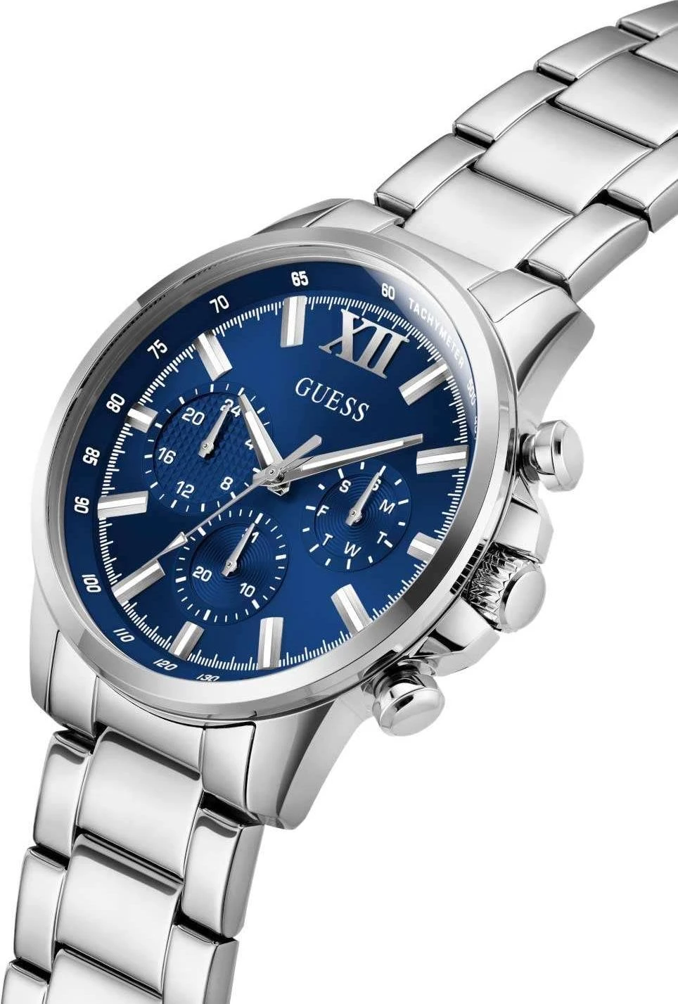 Мужские наручные часы Guess Dress GW0900G4. Точный кварцевый механизм с аналоговой индикацией. В отличие от механических часов, не требуют завода и работают от батареи, показывая отклонение всего несколько секунд в месяц. На стрелки и отметки нанесен светонакопительный состав, благодаря этому считывать информацию с циферблата возможно и в темноте. Браслет из нержавеющей стали обладает высокой прочностью и износостойкостью, обеспечивая долговечность даже при активной эксплуатации. Материал устойчив к коррозии и сохраняет свой внешний вид надолго. Отображение времени возможно в 12-часовом или 24-часовом формате. Корпус изготовлен из высококачественной нержавеющей стали 316L с высокими антикоррозийными свойствами. Прочное, устойчивое к царапинам минеральное стекло защищает часы от повреждений. Часы являются водонепроницаемыми до 5 Бар. Цвет корпуса: Серебристый. Цвет циферблата: Синий. Высота (с ушками): 44 мм. Толщина: 11 мм. Гарантия: 2 года.