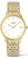 Корпус из нержавеющей стали оттенка желтого золота с двухцветным (серебристым и желто-золотым) браслетом из нержавеющей стали. Фиксированный безель из нержавеющей стали оттенка желтого золота. Белый циферблат со стрелками и часовыми метками оттенка желтого золота. Минутные метки по внешнему ободу. Тип циферблата: аналоговый. Указатель даты в положении «3 часа». Кварцевый механизм Longines Calibre L157. Устойчивое к царапинам сапфировое стекло. Прочная задняя крышка. Круглая форма корпуса, размер корпуса: 35 мм, толщина корпуса: 8,3 мм, ширина ремешка: 18 мм. Зстёжка с откидной кнопкой. Водонепроницаемость до 30 метров / 100 футов. Функции: дата, часы, минуты, секунды, индикатор заряда батареи.