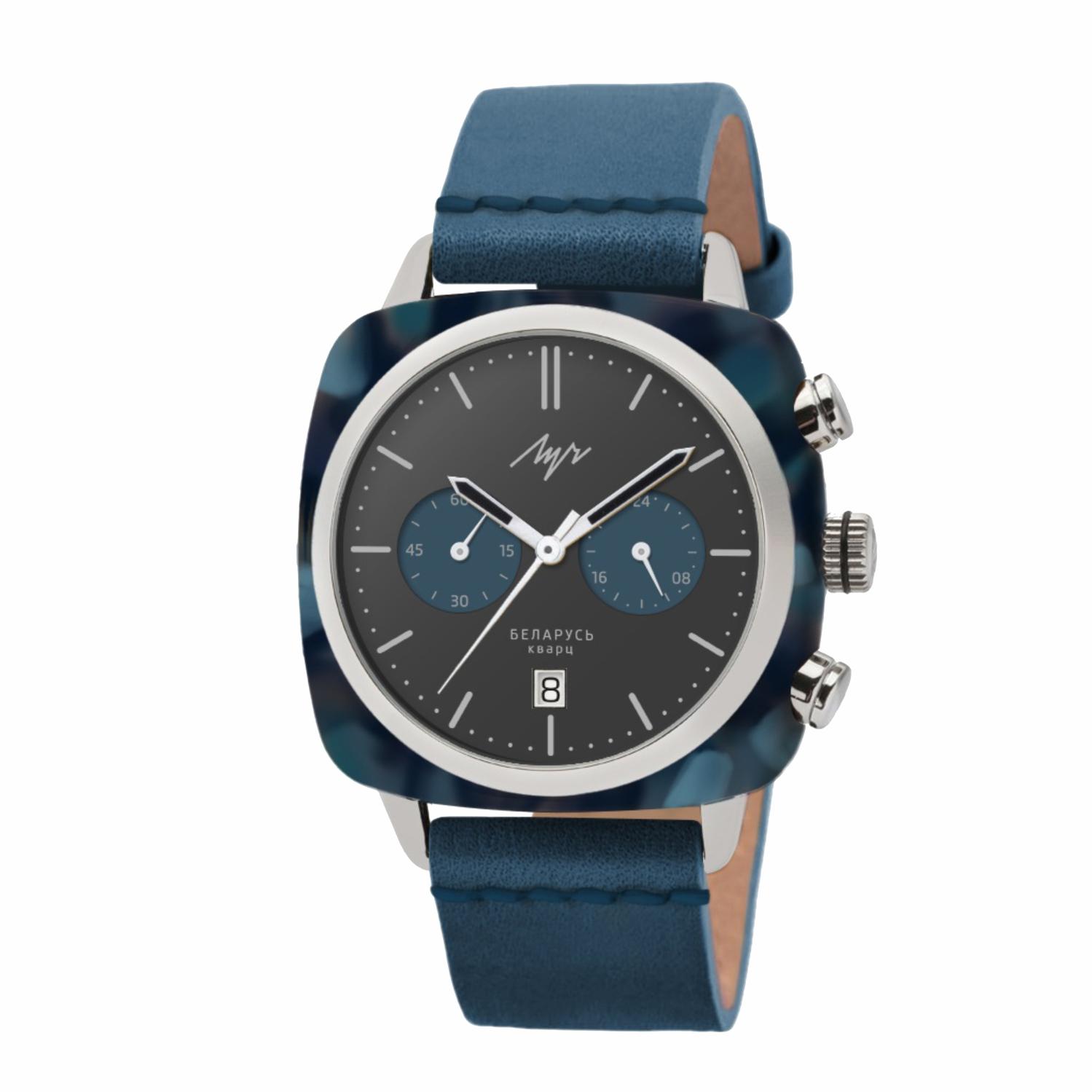 Мужские наручные часы Luch 80`S 740257588. Точный кварцевый механизм с аналоговой индикацией. Ремешок изготовлен из кожи. Функция хронографа. Отображение времени возможно в 12-часовом или 24-часовом формате. Браслет из нержавеющей стали. Прочное, устойчивое к царапинам минеральное стекло защищает часы от повреждений. На циферблате отображается текущее число месяца. Часы являются водонепроницаемыми до 3 Бар. Цвет циферблата: Серебристый. Цвет циферблата: Синий. Цвет корпуса: Черный. На стрелки и отметки нанесен светонакопительный состав, благодаря этому считывать информацию с циферблата возможно и в темноте. Толщина: 13 мм. Гарантия: 2 года.