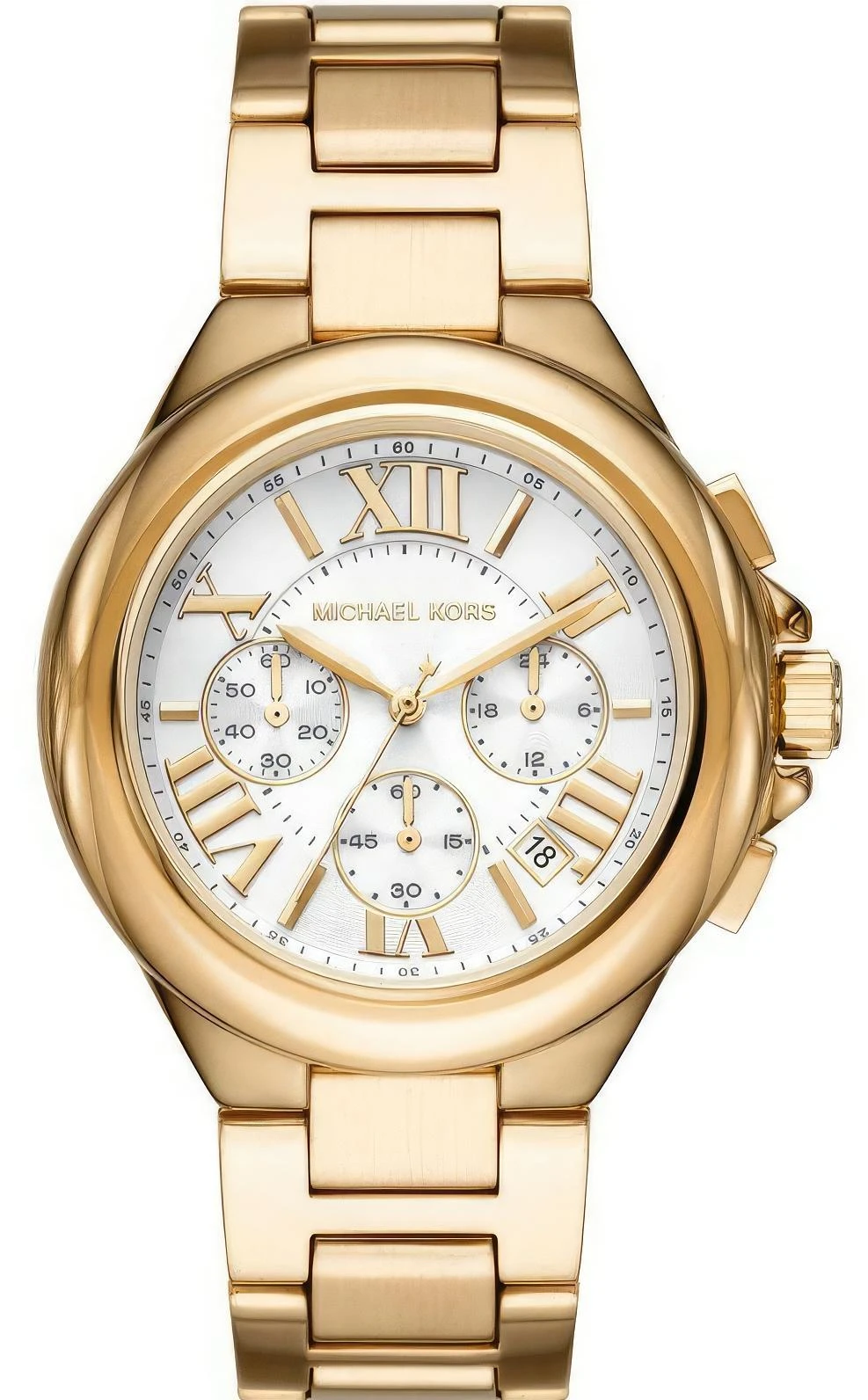 Мужские наручные часы Michael Kors Camille MK7270. Точный кварцевый механизм с аналоговой индикацией. Браслет из нержавеющей стали. Функция хронографа. Отображение времени возможно в 12-часовом или 24-часовом формате. Браслет из нержавеющей стали. Прочное, устойчивое к царапинам минеральное стекло защищает часы от повреждений. На циферблате отображается текущее число месяца. Часы являются водонепроницаемыми до 5 Бар. Цвет циферблата: Желтое золото. Цвет корпуса: Белый. Цвет корпуса: Серебристый. Толщина: 12 мм. Гарантия: 2 года.
