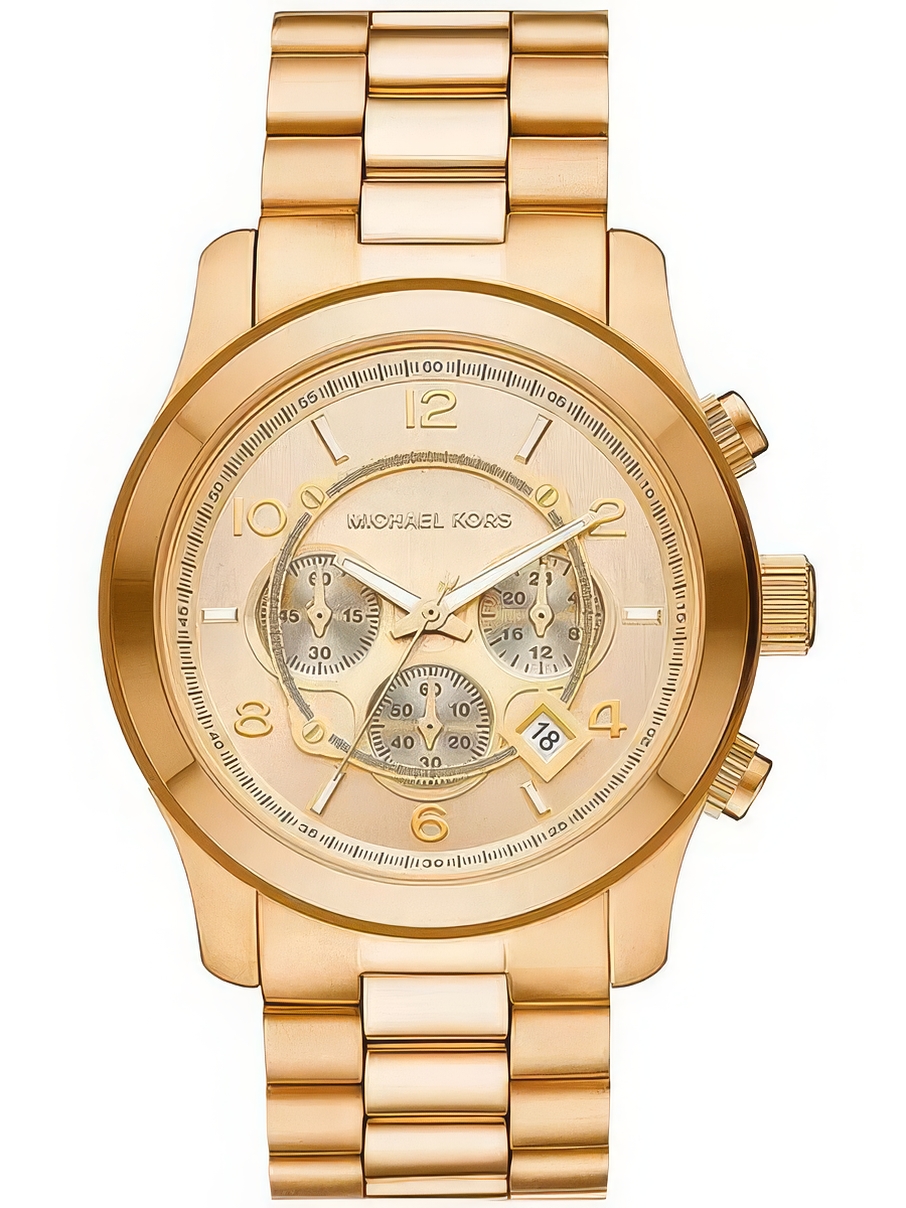 Унисекс наручные часы Michael Kors Runway MK9074. Точный кварцевый механизм с аналоговой индикацией. Браслет из нержавеющей стали. Функция хронографа. Отображение времени возможно в 12-часовом или 24-часовом формате. Браслет из нержавеющей стали. Прочное, устойчивое к царапинам минеральное стекло защищает часы от повреждений. На циферблате отображается текущее число месяца. Часы являются водонепроницаемыми до 10 Бар. Цвет циферблата: Желтое золото. Цвет корпуса: Золотистый. На стрелки и отметки нанесен светонакопительный состав, благодаря этому считывать информацию с циферблата возможно и в темноте. Толщина: 12 мм. Гарантия: 2 года.