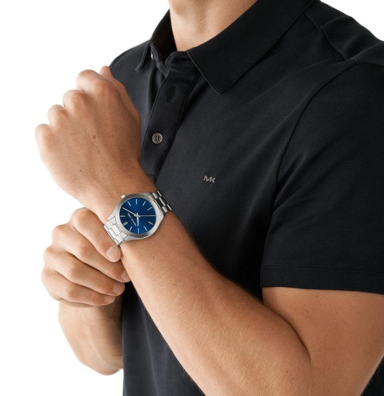 Мужские наручные часы Michael Kors Slim Runway MK1060SET. Точный кварцевый механизм с аналоговой индикацией. Корпус изготовлен из высококачественной нержавеющей стали 316L с высокими антикоррозийными свойствами. Браслет из нержавеющей стали. Прочное, устойчивое к царапинам минеральное стекло защищает часы от повреждений. Часы являются водонепроницаемыми до 5 Бар. Цвет корпуса: Серебристый. Цвет циферблата: Синий. Ширина (с заводной головкой): 40мм. Толщина: 7мм. Гарантия: 2 года.