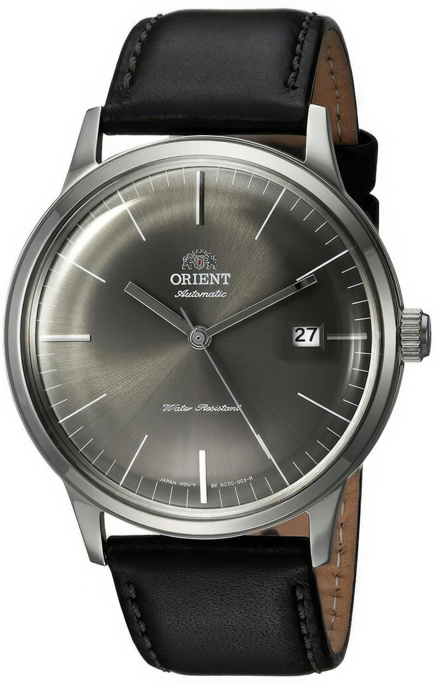Мужские наручные часы с автоподзаводом на черном кожаном ремешке. Окно даты в положении 3 часа. Центральные секундная, минутная и часовая стрелки. Вместо цифр риски на черном циферблате. Минеральное стекло.