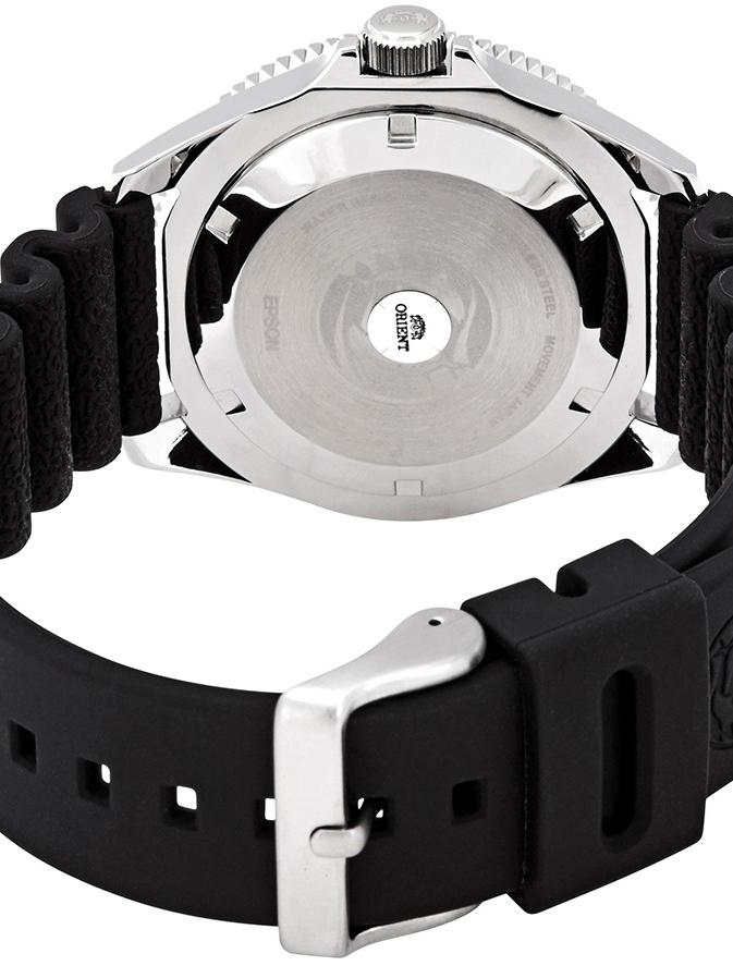 Автоматический механизм ORIENT F69(AA) (22 рубиновых камня, частота полуколебаний баланса 21600 полуоб/час. Автоподзавод. Возможность ручного завода. Противоударное устройство оси баланса.). Центральная секундная стрелка. Окошко даты и дня недели. • Запас хода более 40 часов. • Точность хода не хуже -15...+25 сек./в сутки. • Функция стоп-секунда (остановка секундной стрелки для установки точного времени) • Минеральное стекло устойчивое к царапанию. • Светонакопительный состав на стрелках и маркерах часа. • Корпус из высококачественного стального сплава 316L с высокими антикоррозийными свойствами. • Однонаправленный поворотный безель. • Завинчивающаяся заводная головка. • Водозащита до 20 АТМ. • Ремешок из натурального каучука.