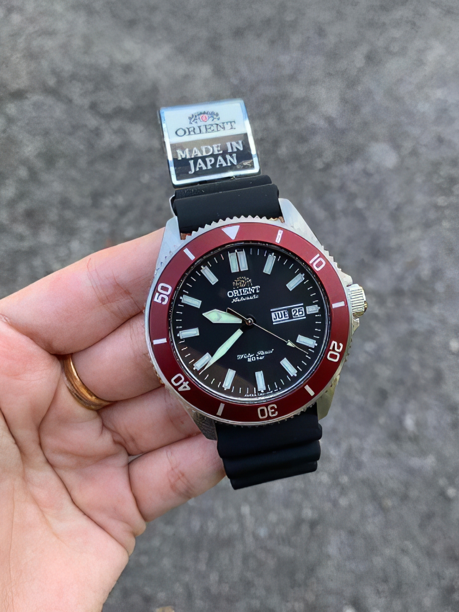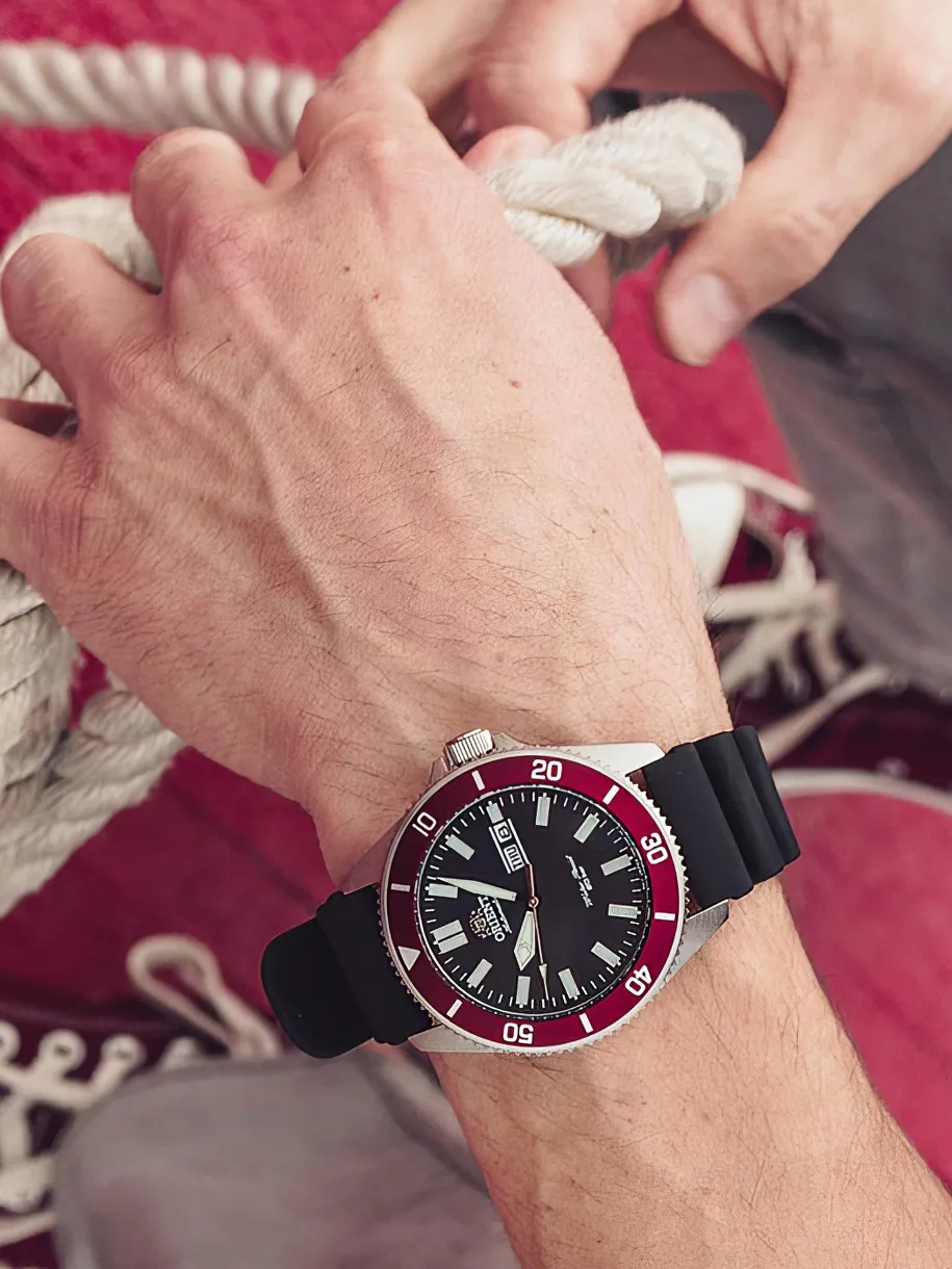 Автоматический механизм ORIENT F69(AA) (22 рубиновых камня, частота полуколебаний баланса 21600 полуоб/час. Автоподзавод. Возможность ручного завода. Противоударное устройство оси баланса.). Центральная секундная стрелка. Окошко даты и дня недели. • Запас хода более 40 часов. • Точность хода не хуже -15...+25 сек./в сутки. • Функция стоп-секунда (остановка секундной стрелки для установки точного времени) • Минеральное стекло устойчивое к царапанию. • Светонакопительный состав на стрелках и маркерах часа. • Корпус из высококачественного стального сплава 316L с высокими антикоррозийными свойствами. • Однонаправленный поворотный безель. • Завинчивающаяся заводная головка. • Водозащита до 20 АТМ. • Ремешок из натурального каучука.