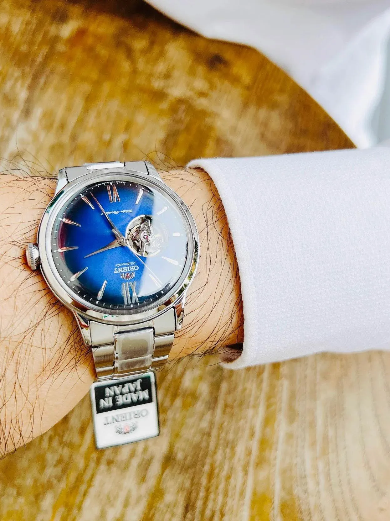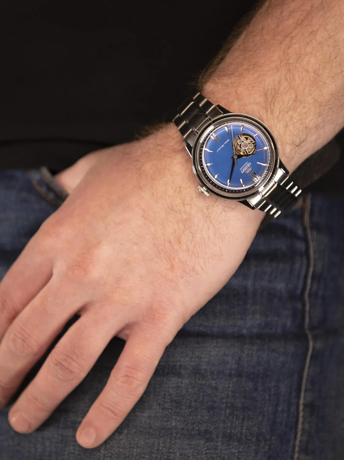 • Сквозь апертуру циферблата видна работа анкерного механизма и колебания баланса.
