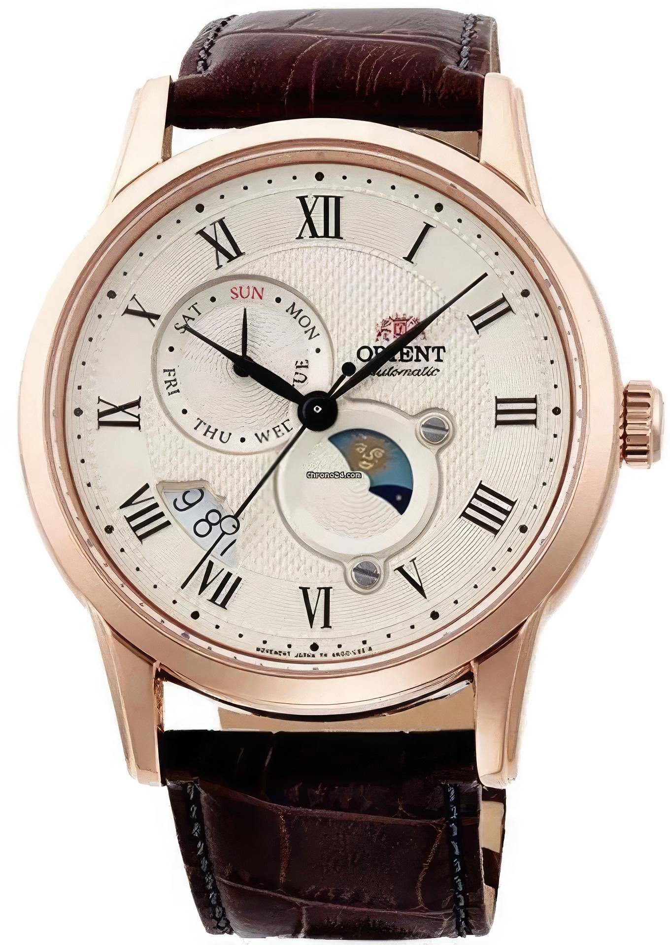 Мужские механические наручные часы с автоподзаводом и возможностью ручного завода коллекции Sun & Moon. Круглый стальной корпус с PVD покрытием цвета розового золота. Циферблат цвета шампань. Сапфировое стекло. WR 50 м. Коричневый кожаный ремешок.