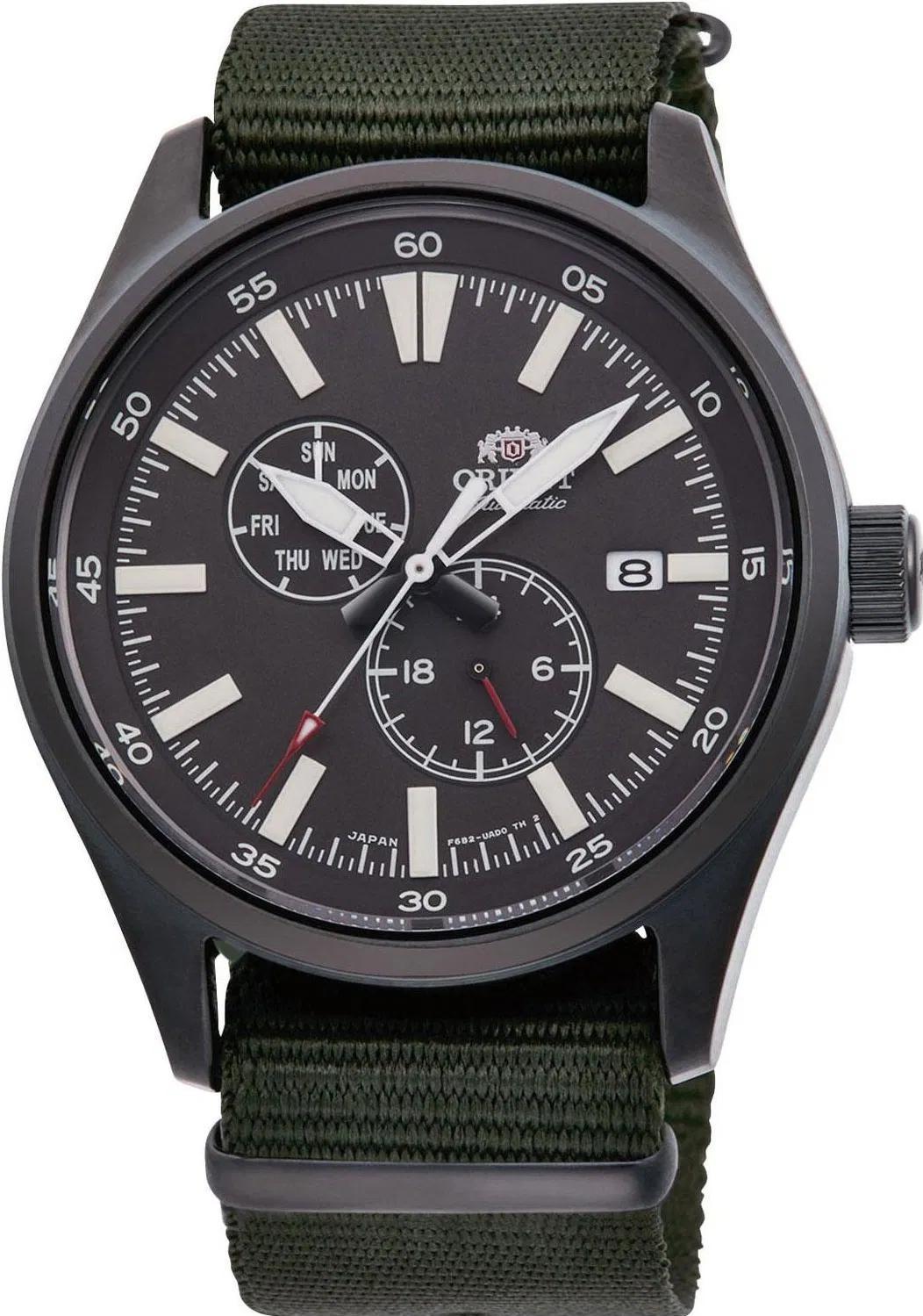 Японский автоматический механизм ORIENT F6B22(AK) (22 рубиновых камня, частота полуколебаний баланса 21600 полуоб/час. Автоподзавод. Возможность ручного завода. Противоударное устройство оси баланса.). Центральная секундная стрелка. • Запас хода более 40 часов. • Точность хода не хуже -15...+25 сек./в сутки. • Функция стоп-секунда (остановка секундной стрелки для установки точного времени). Апертура даты в позиции 3 часов. • Указатели дня недели и суточника в отдельных окошках. • Светонакопительный состав на стрелках и маркерах часа. • Корпус из стального сплава 316L с высокими антикоррозийными свойствами с PVD покрытием черного цвета. • Завинчивающаяся заводная головка. • Минеральное стекло устойчивое к возникновению царапин. • Водозащита до 10 АТМ. • Прочный матерчатый ремешок. • Ширина крепления ремешка 22 мм. • Простая ремешковая пряжка.