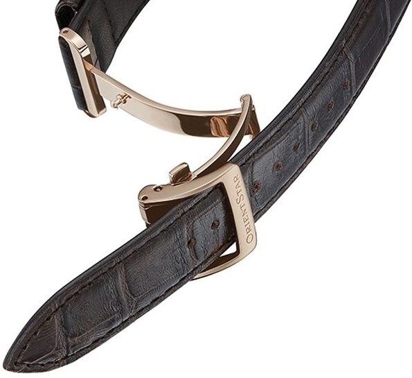 Мужские механические часы с автоподзаводом из серии Orient Star. Круглый стальной корпус с PVD покрытием цвета розового золота. Белый циферблат. Коричневый кожаный ремешок. Сапфировое выпуклое стекло. Водозащита 50 м. Раскладывающаяся застежка.