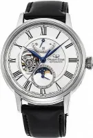• Автоматический механизм ORIENT F7M62(AY) (22 рубиновых камня, частота полуколебаний баланса 21600 полуоб/час. Автоподзавод. Возможность ручного завода. Противоударное устройство оси баланса.). • Центральная секундная стрелка. • Индикатор фазы луны. • Ретроградный указатель запаса хода. • Стрелочный индикатор даты. • Запас хода более 50 часов. • Точность хода не хуже -5…+25 сек./в сутки. • Функция стоп-секунда (остановка секундной стрелки для установки точного времени). • Сквозь апертуру циферблата видна работа анкерного механизма и колебания баланса. • Сапфировое стекло устойчивое к царапанию. • Антибликовое покрытие внутренней поверхности стекла. • Задняя крышка со смотровым окном. • Корпус из высококачественного стального сплава 316L с высокими антикоррозийными свойствами. • Водозащита до 5 АТМ. • Черный кожаный ремешок. • Браслетный замок типа "бабочка", расстегиваемый одним касанием.
