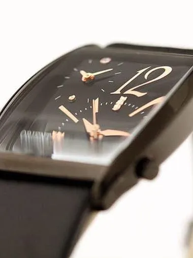 Женские наручные часы с функцией двойного времени, в корпусе бочкообразной формы на чёрном кожаном ремешке в цвет циферблата.