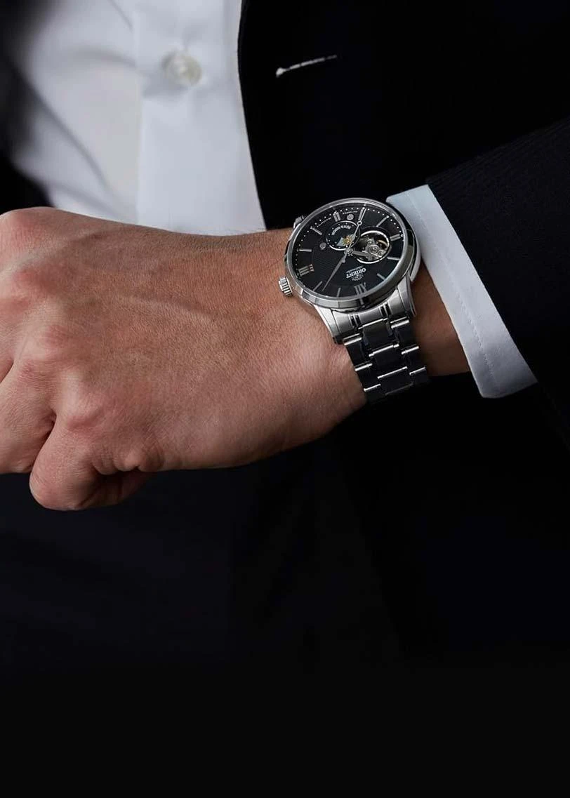 . Автоматические с ручным подзаводом. Пружина механизма заводится автоматически благодаря естественным движениям владельца в процессе ежедневной носки часов. Также есть возможность ручного завода. Браслет из нержавеющей стали обладает высокой прочностью и износостойкостью, обеспечивая долговечность даже при активной эксплуатации. Материал устойчив к коррозии и сохраняет свой внешний вид надолго. Корпус изготовлен из высококачественной нержавеющей стали 316L с высокими антикоррозийными свойствами. Сапфировое стекло. Искусственно изготовленное стекло с высокой прочностью и устойчивостью к царапинам. Часы являются водонепроницаемыми до 5 Бар. Цвет корпуса: Серебристый. Цвет циферблата: Черный. Высота (с ушками): 49.5 мм. Толщина: 14 мм. Гарантия: 2 года.