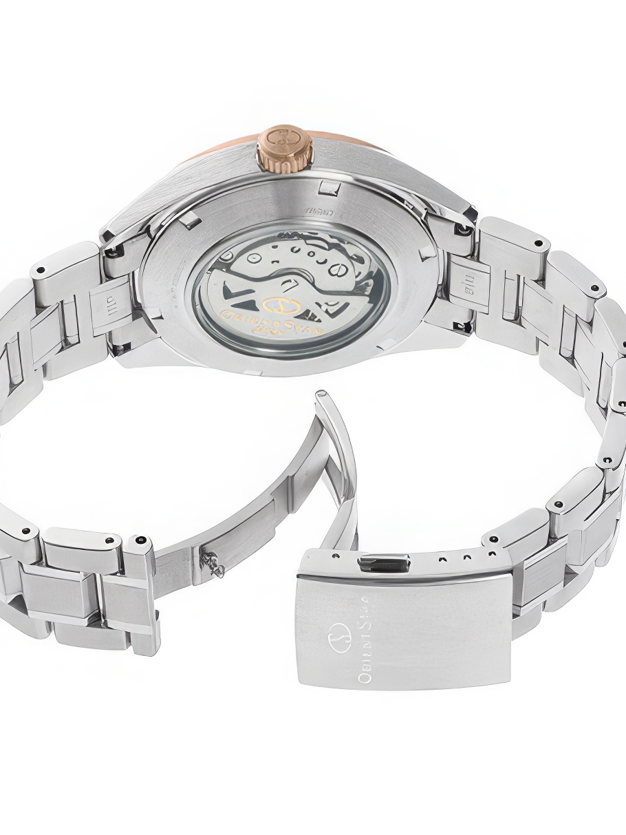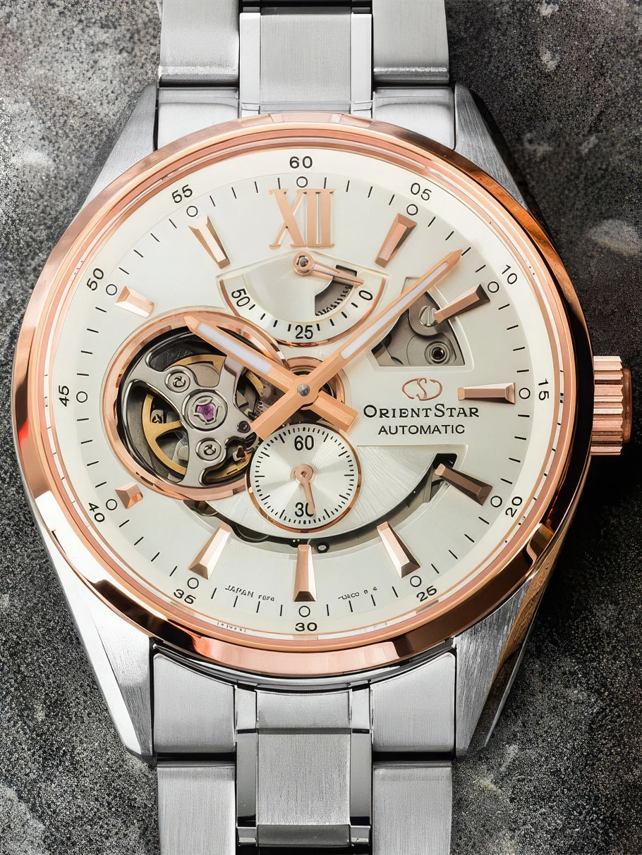 Мужские наручные часы Orient Orient Star RE-AV0123G. Механические с автоподзаводом. Пружина механизма заводится автоматически благодаря естественным движениям владельца в процессе ежедневной носки часов. Браслет из нержавеющей стали. Браслет из нержавеющей стали. Сапфировое стекло. Искусственно изготовленное стекло с высокой прочностью и устойчивостью к царапинам. Часы являются водонепроницаемыми до 10 Бар. Цвет циферблата: Розовое золото. Цвет корпуса: Серебристый. На стрелки и отметки нанесен светонакопительный состав, благодаря этому считывать информацию с циферблата возможно и в темноте. Толщина: 12 мм. Гарантия: 2 года.