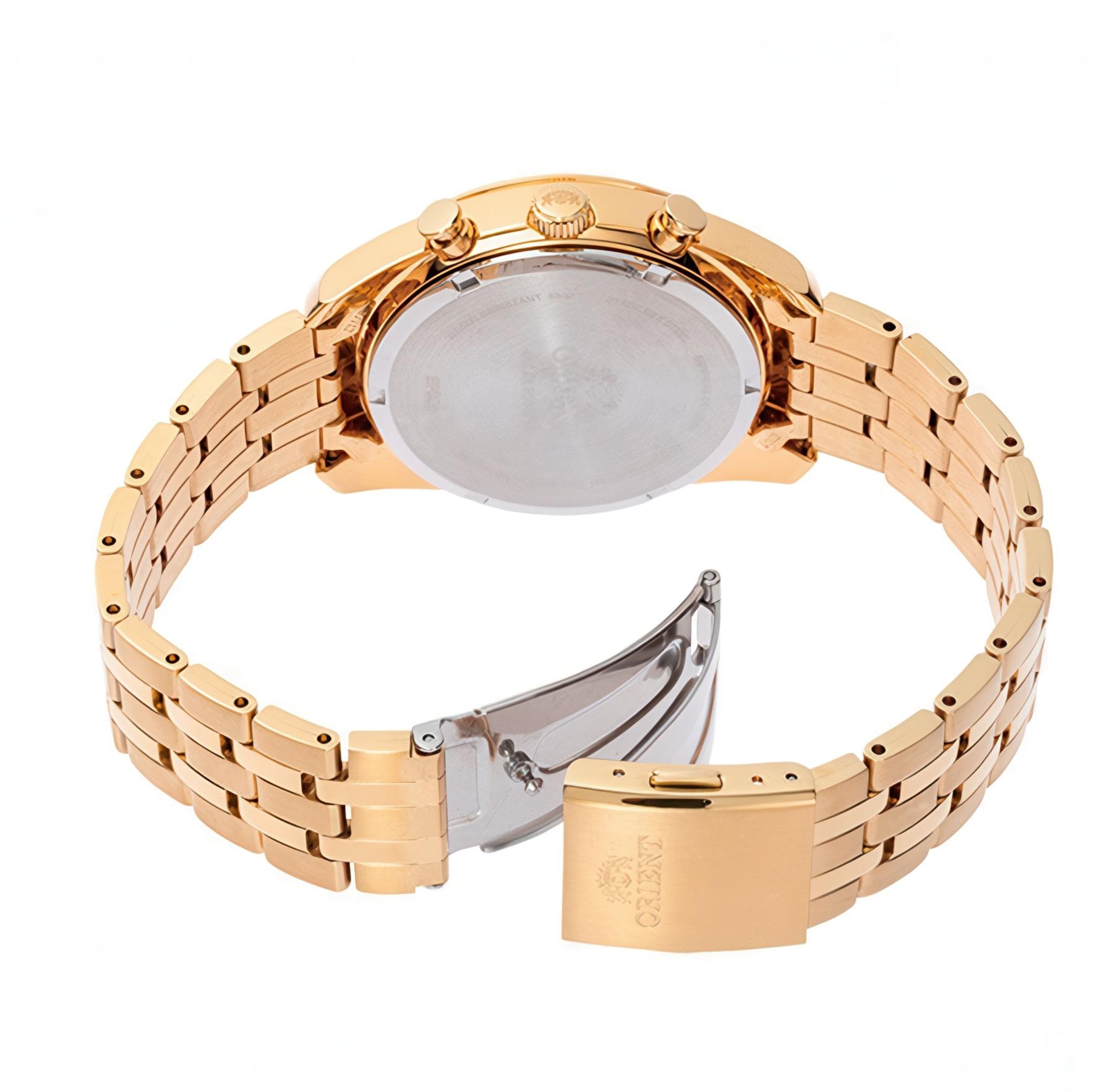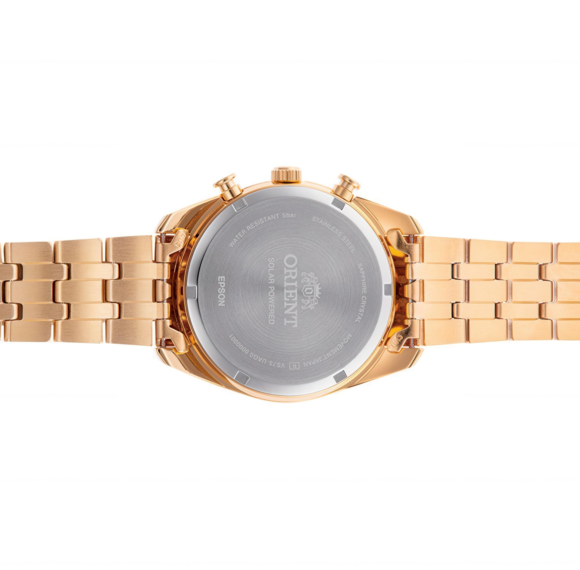 Мужские наручные часы Orient Contemporary RA-TX0301G. Точный кварцевый механизм с аналоговой индикацией. Браслет из нержавеющей стали. Функция хронографа. Солнечная батарейка. Солнечная подзаряжающаяся батарейка обеспечивает питание часов для работы. Браслет из нержавеющей стали. Сапфировое стекло. Искусственно изготовленное стекло с высокой прочностью и устойчивостью к царапинам. На циферблате отображается текущее число месяца. Часы являются водонепроницаемыми до 5 Бар. Цвет циферблата: Желтое золото. Цвет корпуса: Черный. Цвет корпуса: Золотистый. На стрелки и отметки нанесен светонакопительный состав, благодаря этому считывать информацию с циферблата возможно и в темноте. Высота (с ушками): 48 мм. Толщина: 11 мм. Гарантия: 2 года.