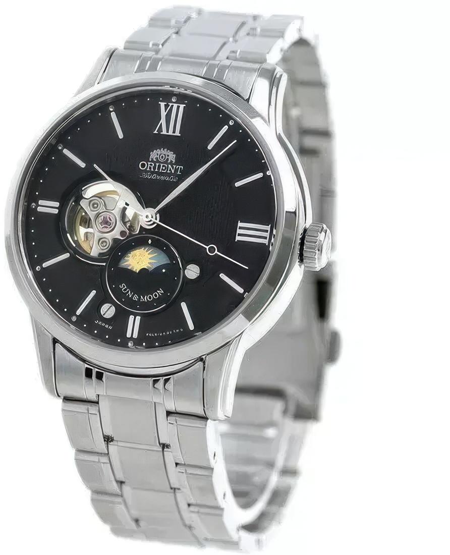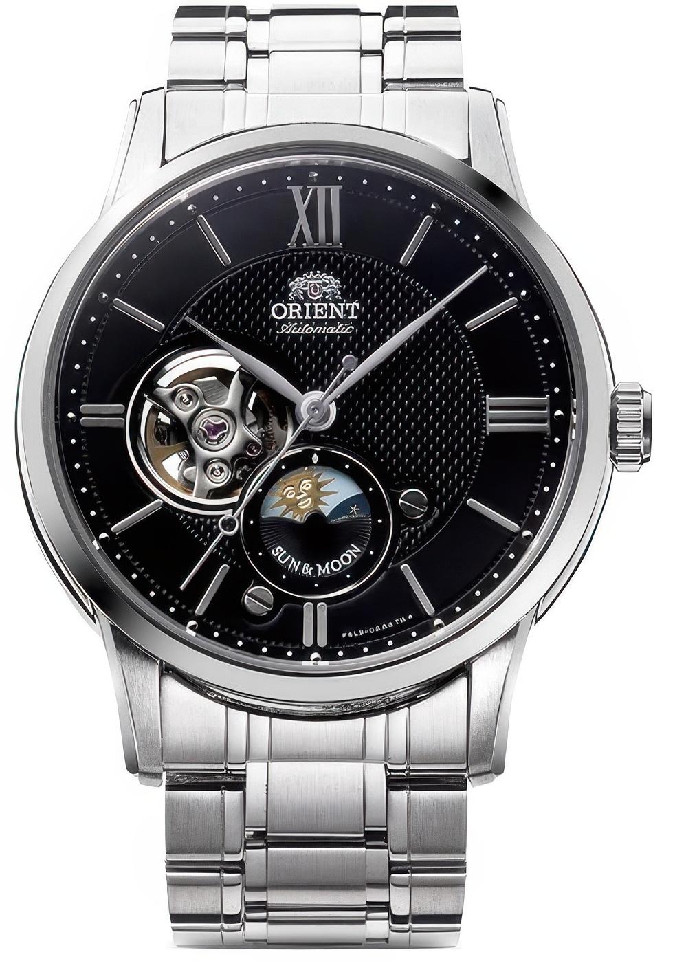 Мужские наручные часы Orient Sun & Moon Classic RN-AS0001B. Механические с ручным подзаводом. Браслет из нержавеющей стали. Браслет из нержавеющей стали. Прочное, устойчивое к царапинам минеральное стекло защищает часы от повреждений. Часы являются водонепроницаемыми до 5 Бар. Цвет циферблата: Серебристый. Цвет корпуса: Черный. Толщина: 14 мм. Гарантия: 2 года.