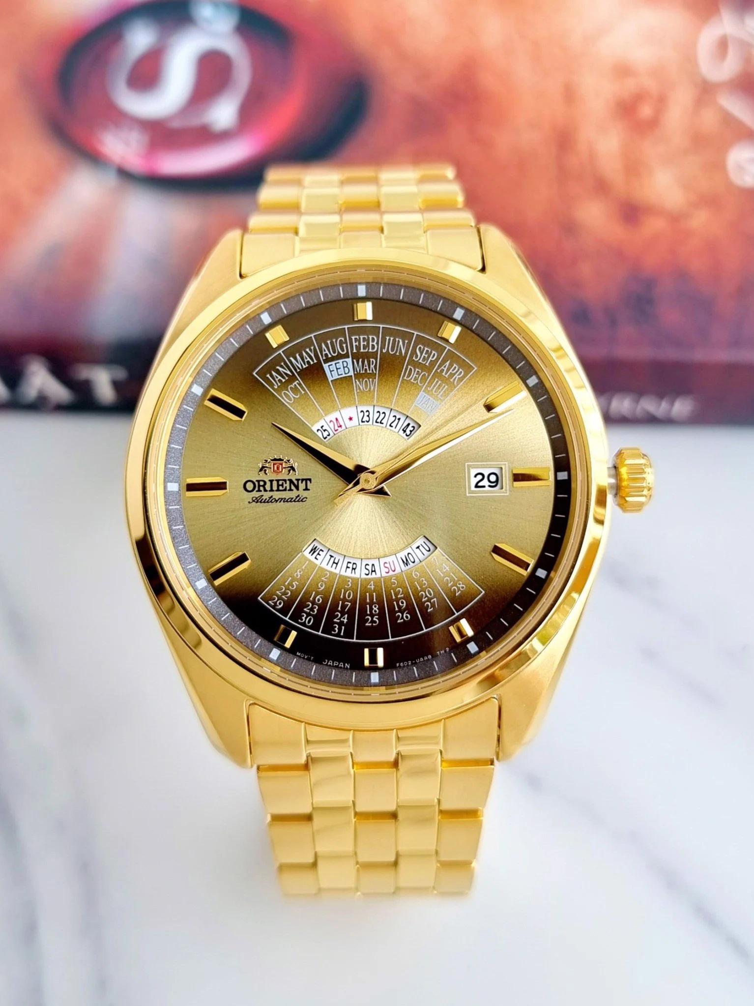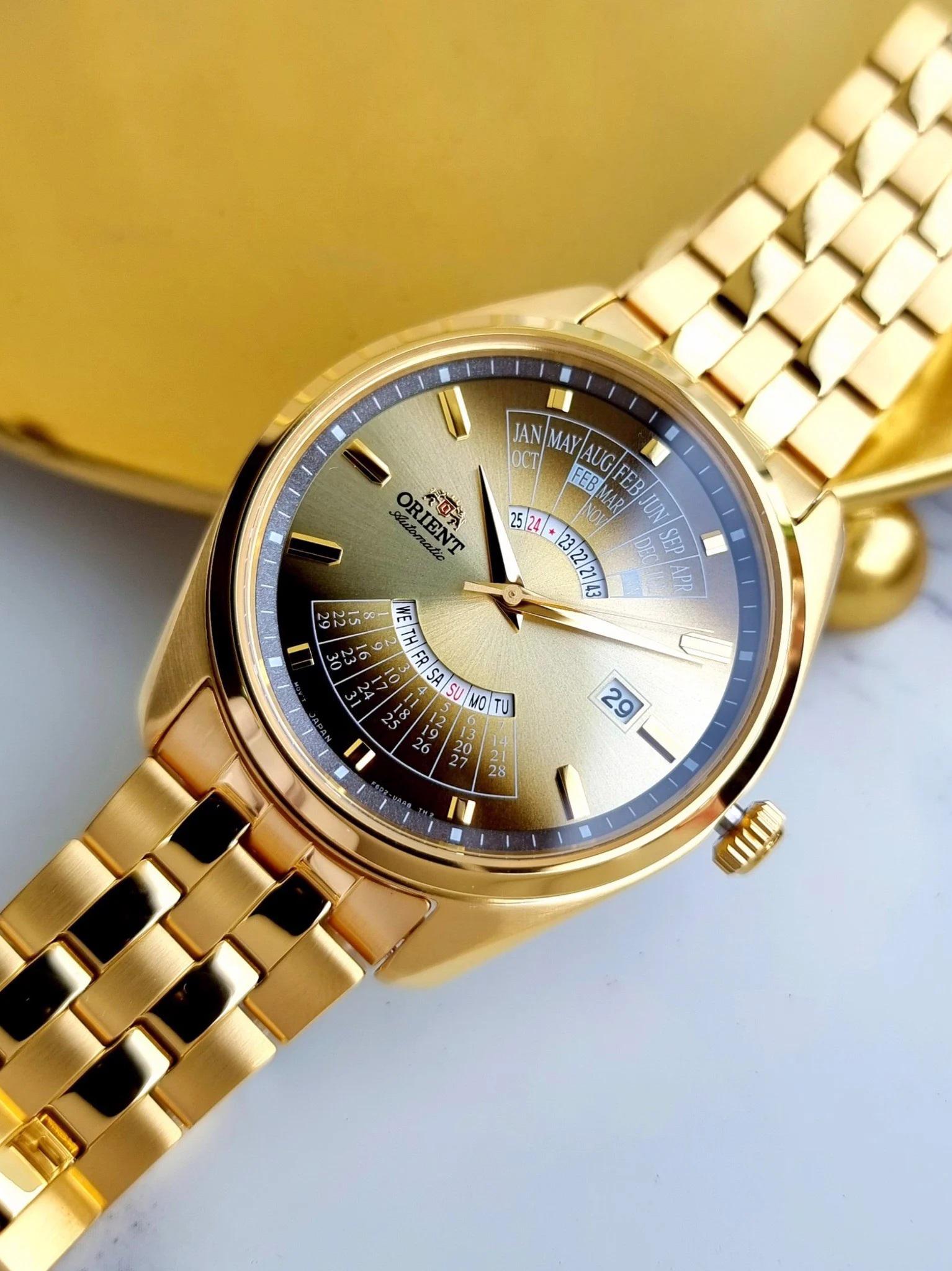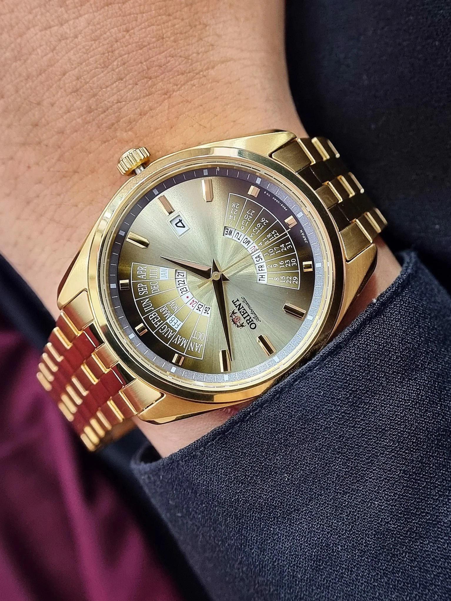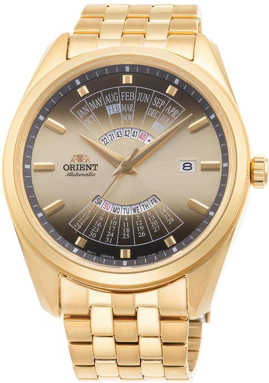 Мужские наручные часы Orient Multi Year Calendar RA-BA0001G. Механические с ручным подзаводом. Браслет из нержавеющей стали. Браслет из нержавеющей стали. Прочное, устойчивое к царапинам минеральное стекло защищает часы от повреждений. На циферблате отображается текущее число месяца и день недели. Часы являются водонепроницаемыми до 5 Бар. Цвет циферблата: Желтое золото. Цвет корпуса: Золотистый. Толщина: 12 мм. Гарантия: 2 года.