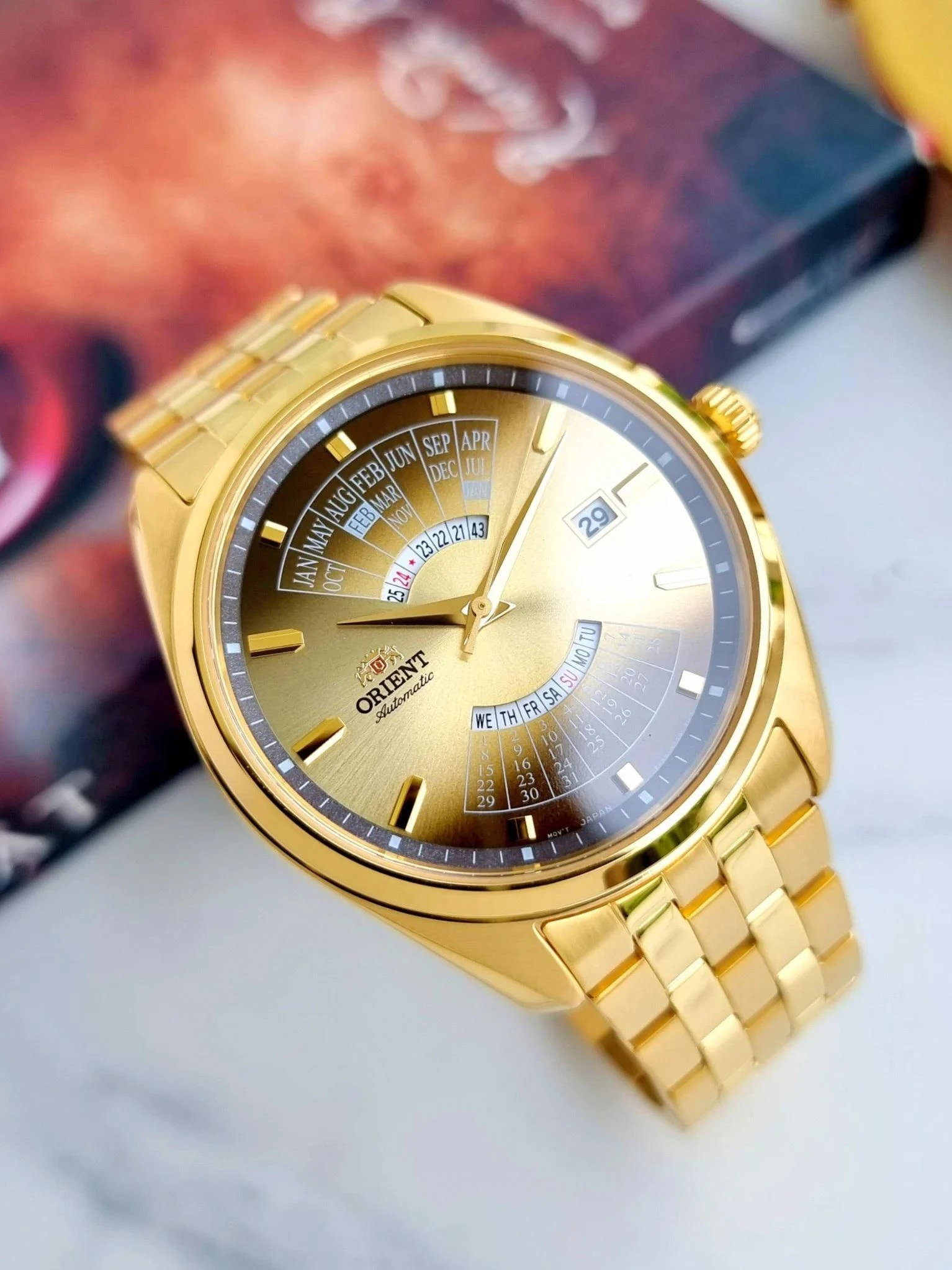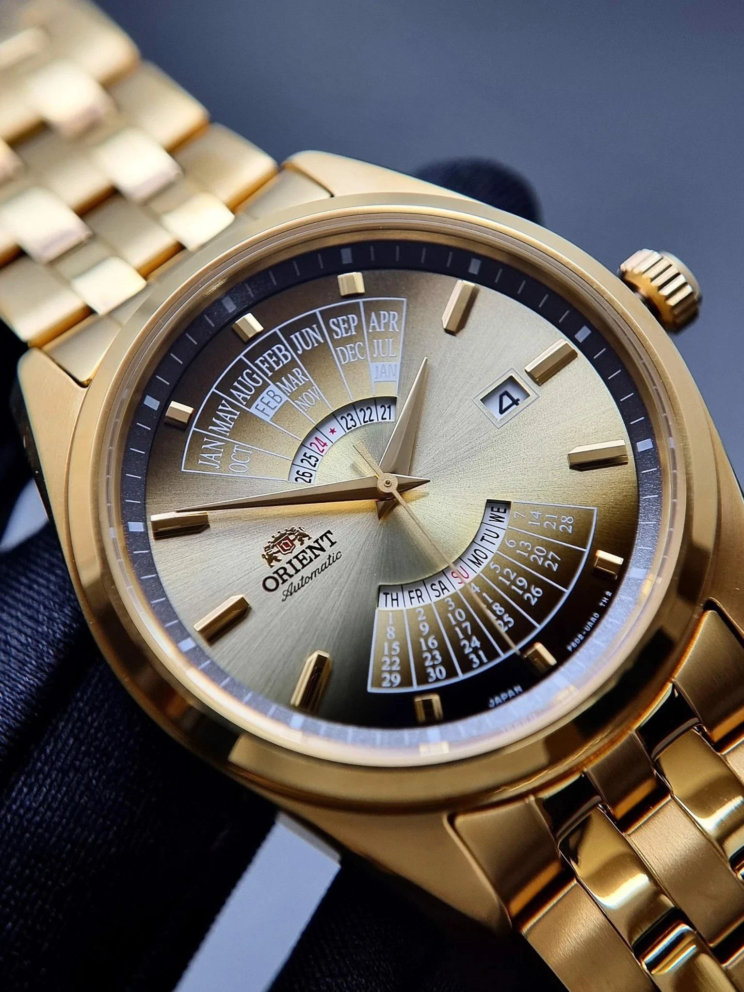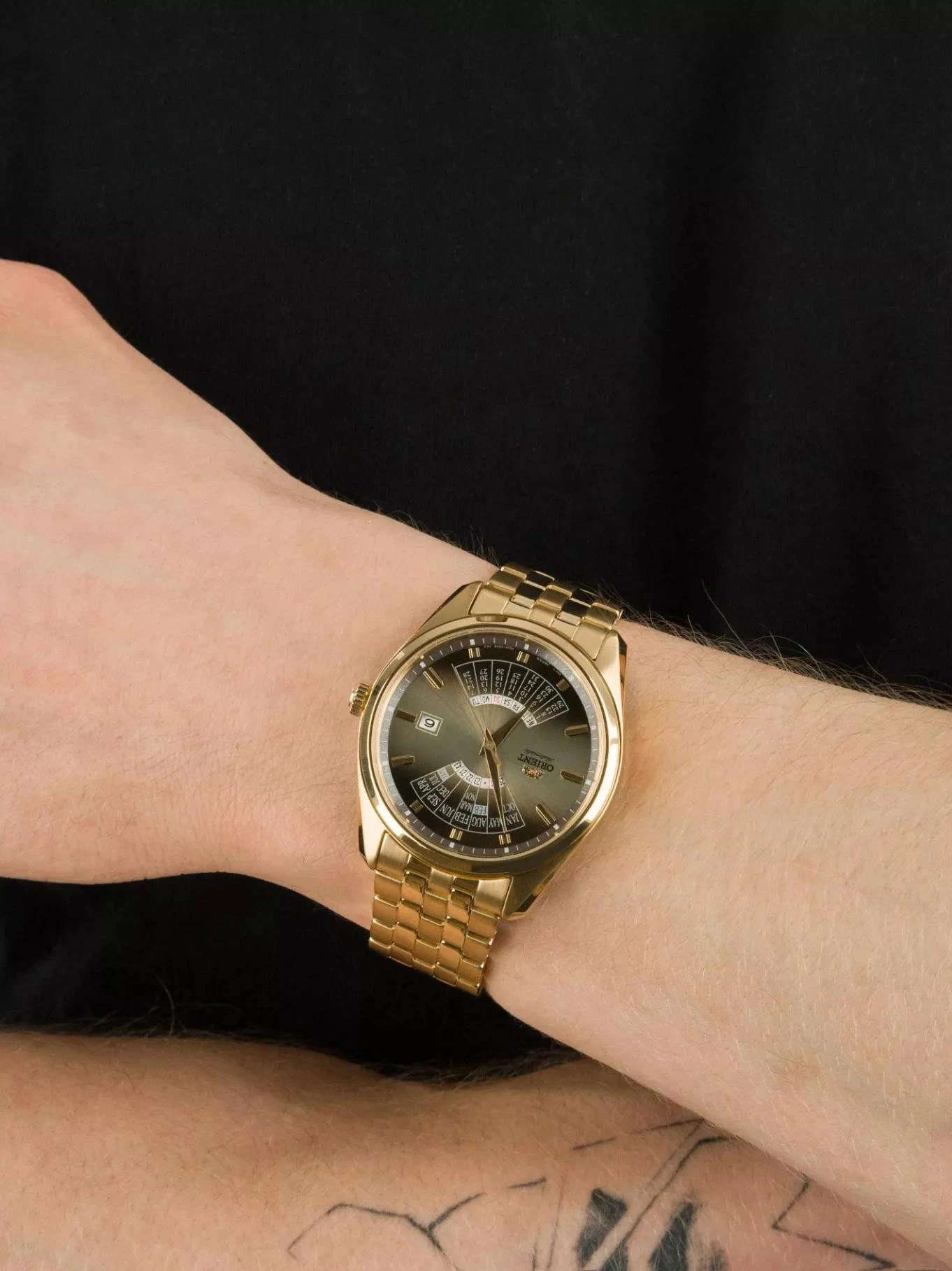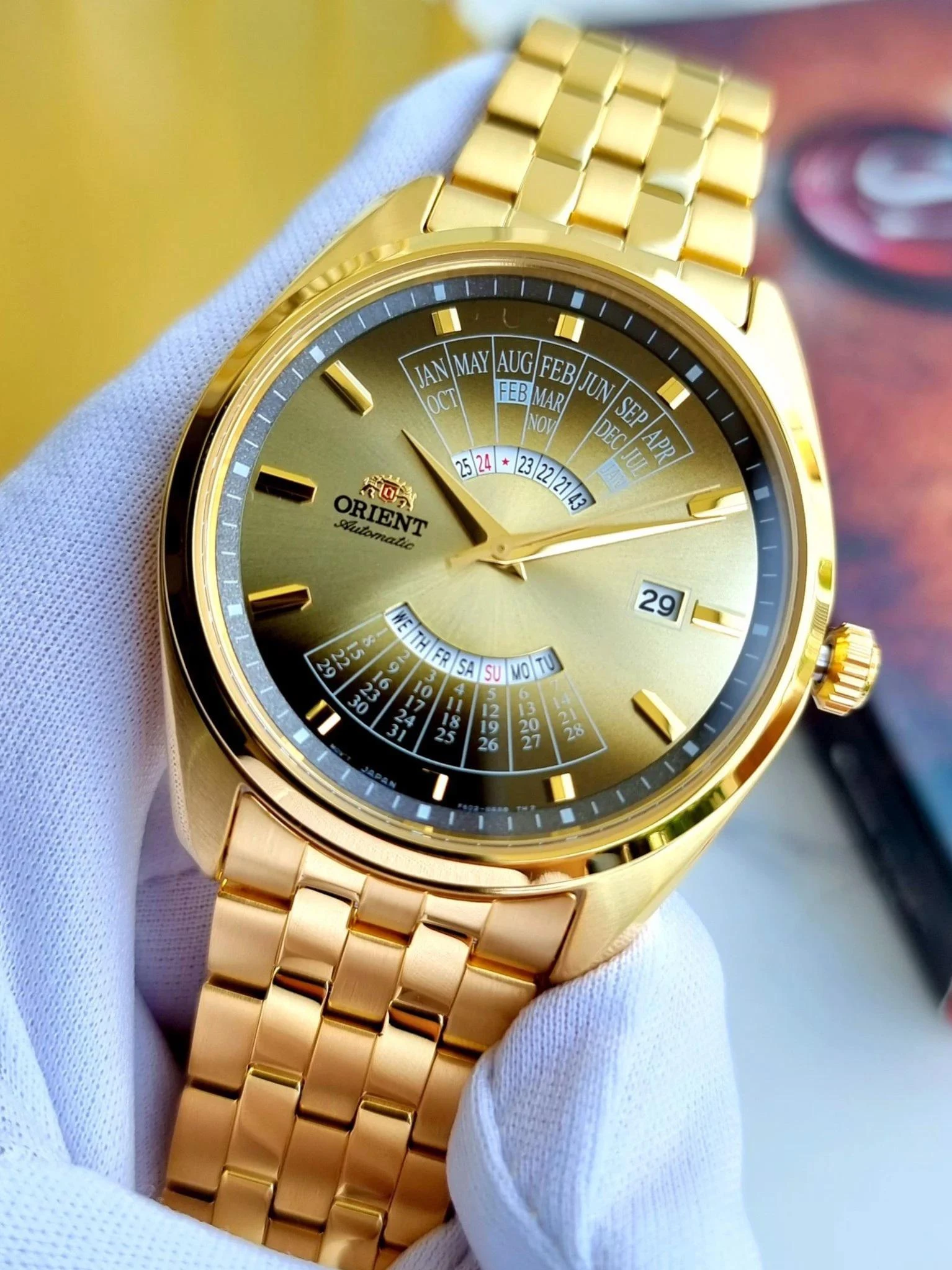 Мужские наручные часы Orient Multi Year Calendar RA-BA0001G. Механические с ручным подзаводом. Браслет из нержавеющей стали. Браслет из нержавеющей стали. Прочное, устойчивое к царапинам минеральное стекло защищает часы от повреждений. На циферблате отображается текущее число месяца и день недели. Часы являются водонепроницаемыми до 5 Бар. Цвет циферблата: Желтое золото. Цвет корпуса: Золотистый. Толщина: 12 мм. Гарантия: 2 года.