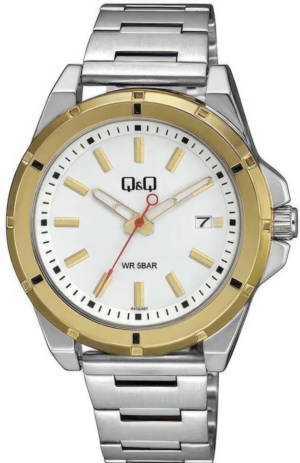Мужские наручные часы Q&Q Attractive A472J401Y. Точный кварцевый механизм с аналоговой индикацией. Корпус изготовлен из высококачественной часовой латуни с высокими антикоррозийными свойствами. На стрелки и отметки нанесен светонакопительный состав, благодаря этому считывать информацию с циферблата возможно и в темноте. На циферблате отображается текущее число месяца. Браслет из нержавеющей стали. Прочное, устойчивое к царапинам минеральное стекло защищает часы от повреждений.Часы являются водонепроницаемыми до 5 Бар. Цвет циферблата: Белый. Ширина (с заводной головкой): 42мм. Толщина: 11мм. Гарантия: 1 год.