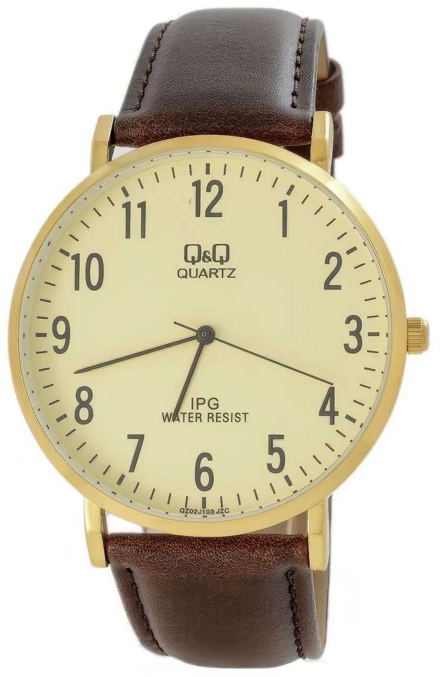 Мужские наручные часы Q&Q Attractive QZ02J103Y. Точный кварцевый механизм с аналоговой индикацией. Корпус изготовлен из высококачественной часовой латуни с высокими антикоррозийными свойствами. Браслет из нержавеющей стали. Прочное, устойчивое к царапинам минеральное стекло защищает часы от повреждений.Часы являются водонепроницаемыми до 3 Бар. Цвет корпуса: Желтое золото. Цвет циферблата: Золотистый. Ширина (с заводной головкой): 42мм. Толщина: 8мм. Гарантия: 1 год.