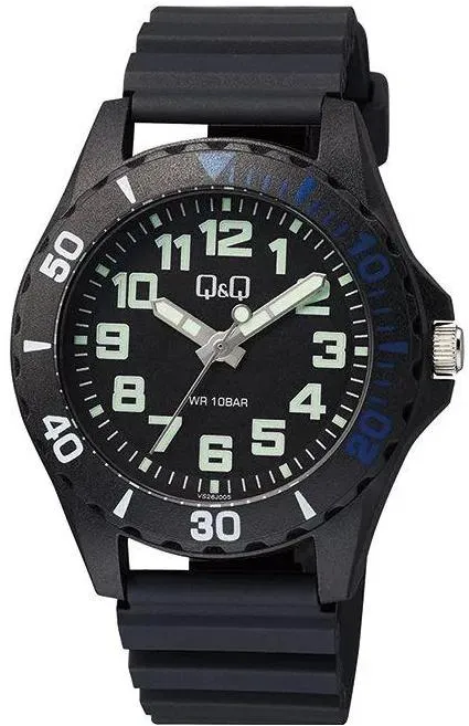 Мужские наручные часы Q&Q Attractive VS26J005Y. Точный кварцевый механизм с аналоговой индикацией. Корпус изготовлен из высококачественной нержавеющей стали 316L с высокими антикоррозийными свойствами. На стрелки и отметки нанесен светонакопительный состав, благодаря этому считывать информацию с циферблата возможно и в темноте. Полимерный ремешок. Натуральный полимерный материал является идеальным для изготовления ремешка благодаря своей чрезвычайной прочности и гибкости. Прочное, устойчивое к царапинам минеральное стекло защищает часы от повреждений. Часы являются водонепроницаемыми до 10 Бар. Цвет корпуса: Черный. Цвет циферблата: Черный. Ширина (с заводной головкой): 42мм. Толщина: 13мм. Гарантия: 1 год.
