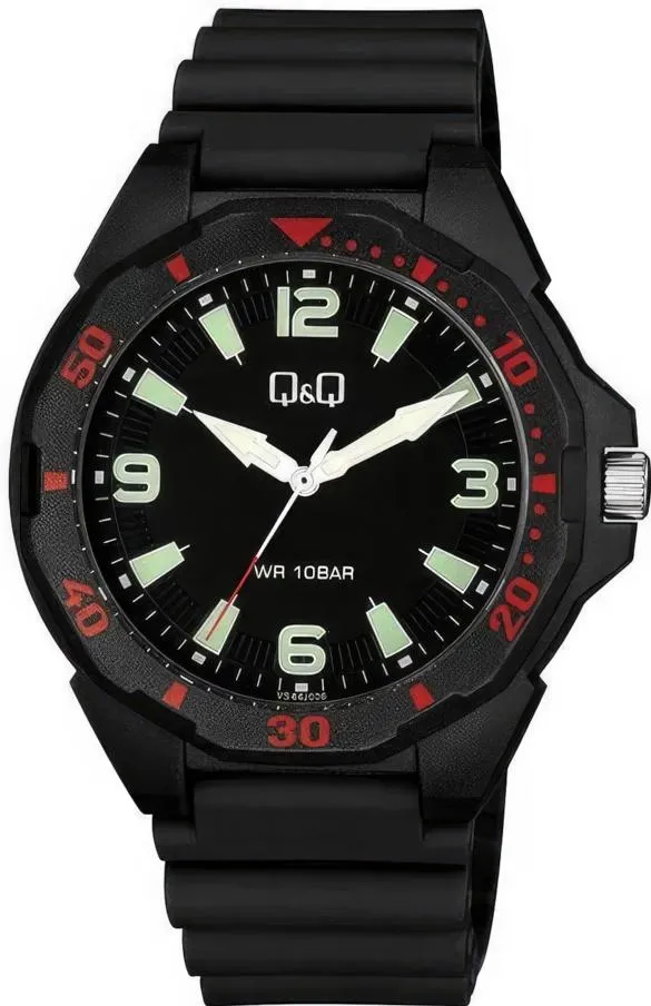 Мужские наручные часы Q&Q Attractive VS44J006Y. Точный кварцевый механизм с аналоговой индикацией. Полимерный корпус надежно защищает часы от механических повреждений. На стрелки и отметки нанесен светонакопительный состав, благодаря этому считывать информацию с циферблата возможно и в темноте. Полимерный ремешок. Натуральный полимерный материал является идеальным для изготовления ремешка благодаря своей чрезвычайной прочности и гибкости. Органическое стекло. Часы являются водонепроницаемыми до 10 Бар. Цвет корпуса: Черный. Цвет циферблата: Черный. Ширина (с заводной головкой): 43мм. Толщина: 12мм. Гарантия: 1 год.