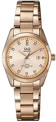 Женские наручные часы Q&Q Attractive Women QZ13J100Y. Точный кварцевый механизм с аналоговой индикацией. Корпус изготовлен из высококачественной часовой латуни с высокими антикоррозийными свойствами. На циферблате отображается текущее число месяца. Ремешок изготовлен из кожи. Прочное, устойчивое к царапинам минеральное стекло защищает часы от повреждений.Часы являются водонепроницаемыми до 5 Бар. Цвет корпуса: Желтое золото. Цвет циферблата: Золотистый. Ширина (с заводной головкой): 38мм. Толщина: 8мм. Гарантия: 1 год.