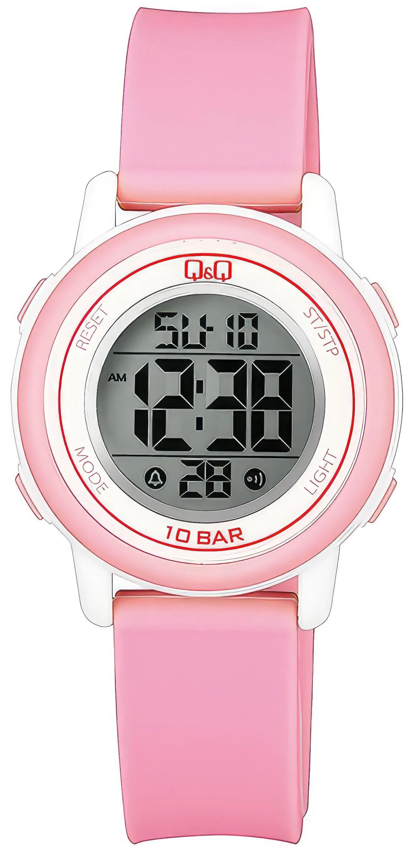 Женские наручные часы Q&Q Digital M208J004Y. Точный кварцевый механизм с цифровой индикацей. Полимерный ремешок. Натуральный полимерный материал является идеальным для изготовления ремешка благодаря своей чрезвычайной прочности и гибкости. Функция будильника. Функция хронографа. Функция таймера. Таймеры обратного отсчета напомнят Вам о текущих или особенных событиях, издав звуковой сигнал в установленное время. Отображение времени возможно в 12-часовом или 24-часовом формате. Полимерный ремешок. Натуральный полимерный материал является идеальным для изготовления ремешка благодаря своей чрезвычайной прочности и гибкости. Органическое стекло. На циферблате отображается текущее число, месяц и день недели. Часы являются водонепроницаемыми до 10 Бар. Цвет циферблата: Белый. Цвет циферблата: Розовый. Цвет корпуса: Белый. Цвет корпуса: Розовый. Светодиодная подсветка. Толщина: 9 мм. Гарантия: 1 год.