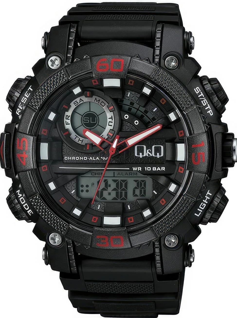 Мужские наручные часы Q&Q DualForce GW87J011Y. Точный кварцевый механизм с аналого-цифровой индикацией. Полимерный корпус надежно защищает часы от механических повреждений. Светодиодная подсветка. На циферблате отображается текущее число, месяц и день недели. Функция хронографа. Функция будильника. Полимерный ремешок. Натуральный полимерный материал является идеальным для изготовления ремешка благодаря своей чрезвычайной прочности и гибкости. Органическое стекло. Часы являются водонепроницаемыми до 10 Бар. Цвет корпуса: Черный. Цвет циферблата: Черный. Ширина (с заводной головкой): 51мм. Толщина: 19мм. Гарантия: 1 год.