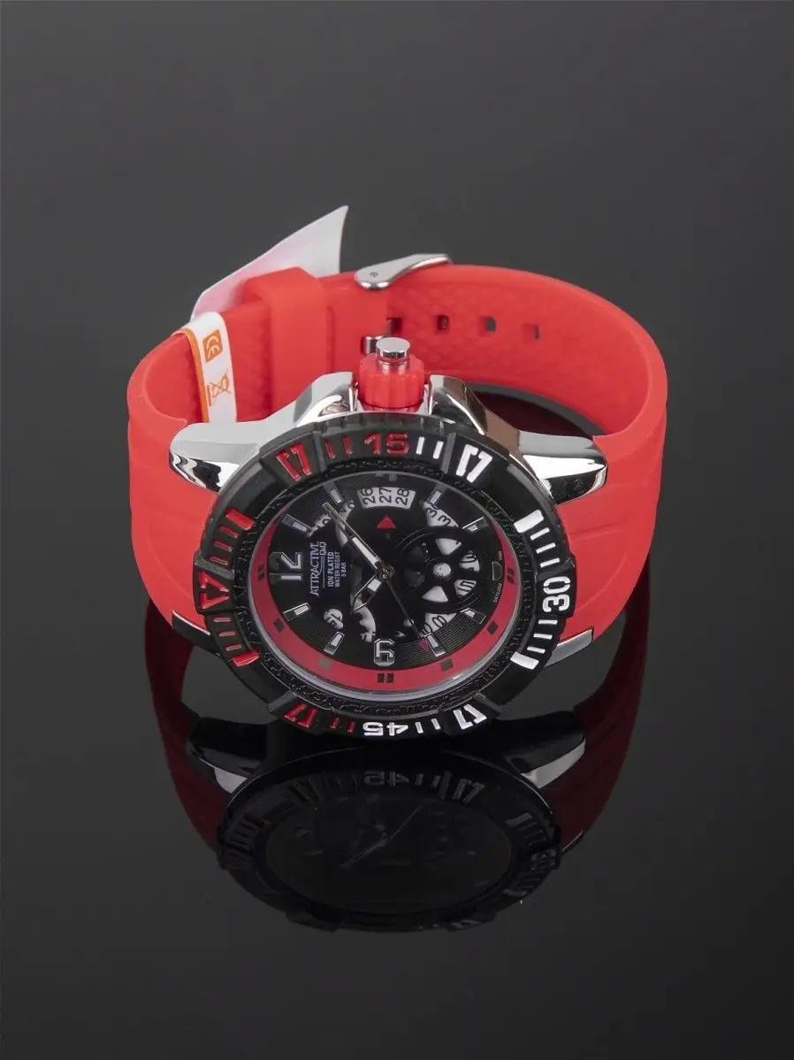 Точный кварцевый механизм. Центральная секундная стрелка. Окошко даты. • Точность хода не хуже -10 +15 сек./в месяц. • Светонакопительный состав на стрелках. • Минеральное стекло устойчивое к возникновению царапин. • Корпус из высококачественного стального сплава и пластика. • Красный каучуковый ремешок. • Водозащита до 5 АТМ. • Диаметр корпуса 45 мм, толщина 12 мм. Вес 55 гр.